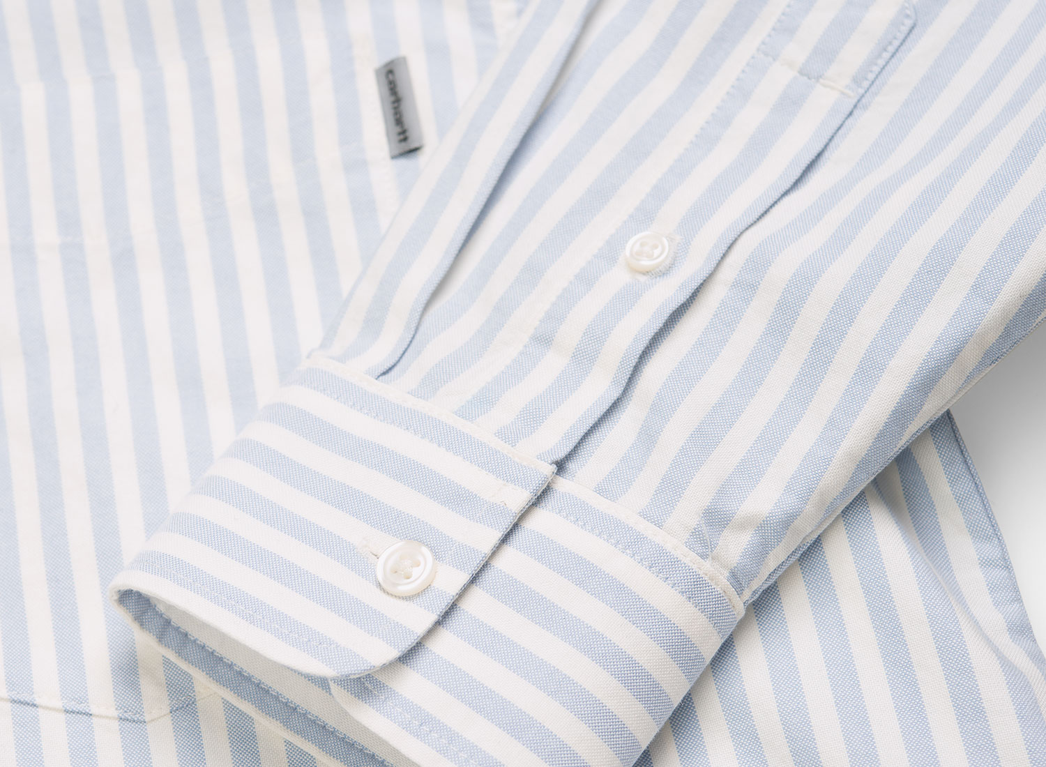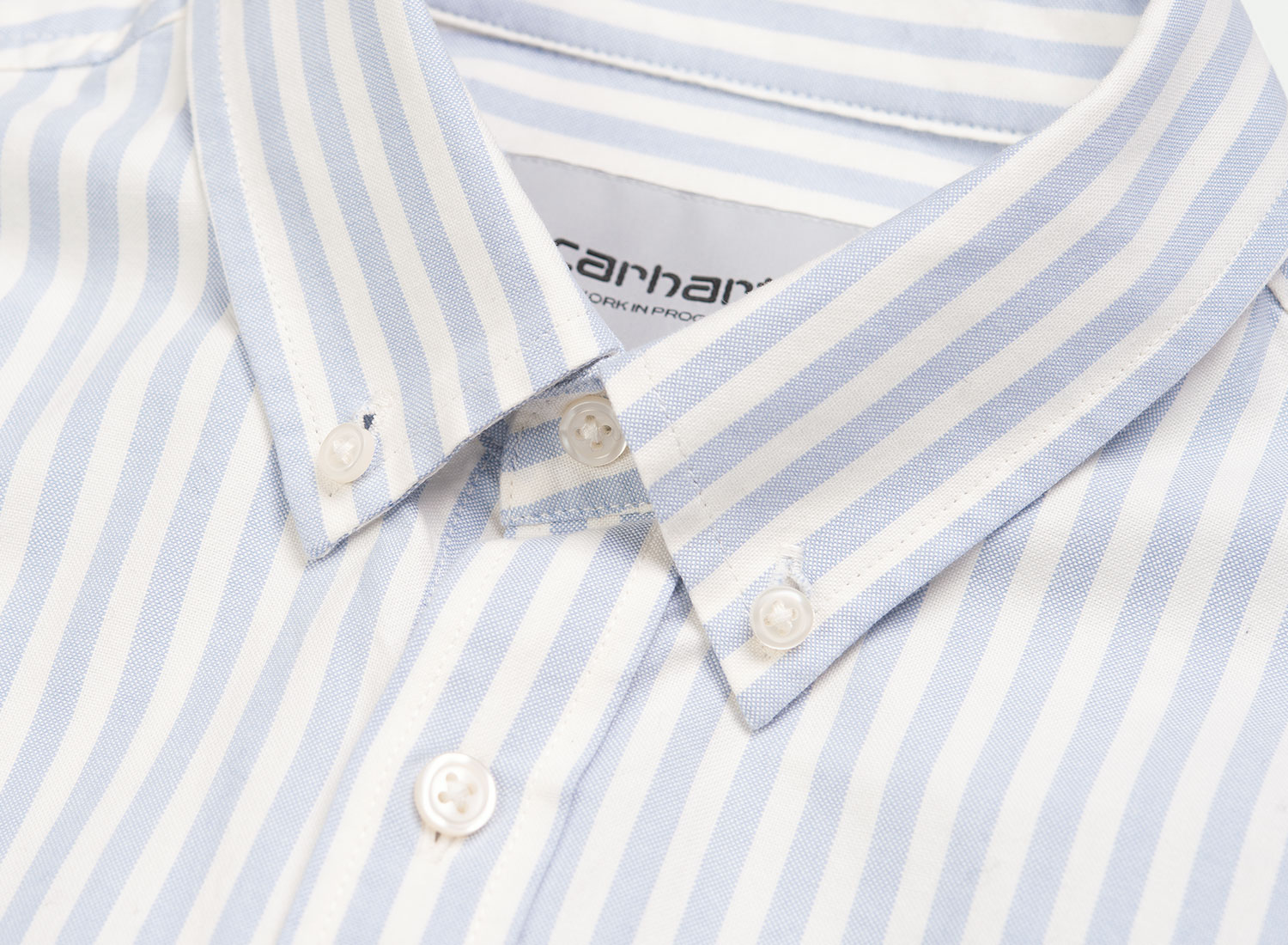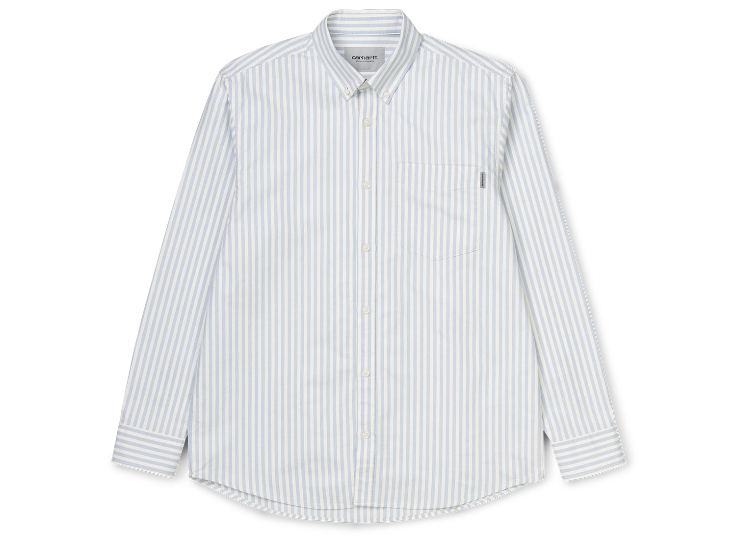 CARHARTT WIP Simon Shirt Stripe Bleach I027500. Chemise coupe droite confectionnée en coton oxford. Col et poignets boutonnés. Poche poitrine. Découpe arrondie sur le bas.