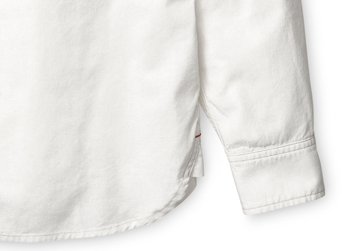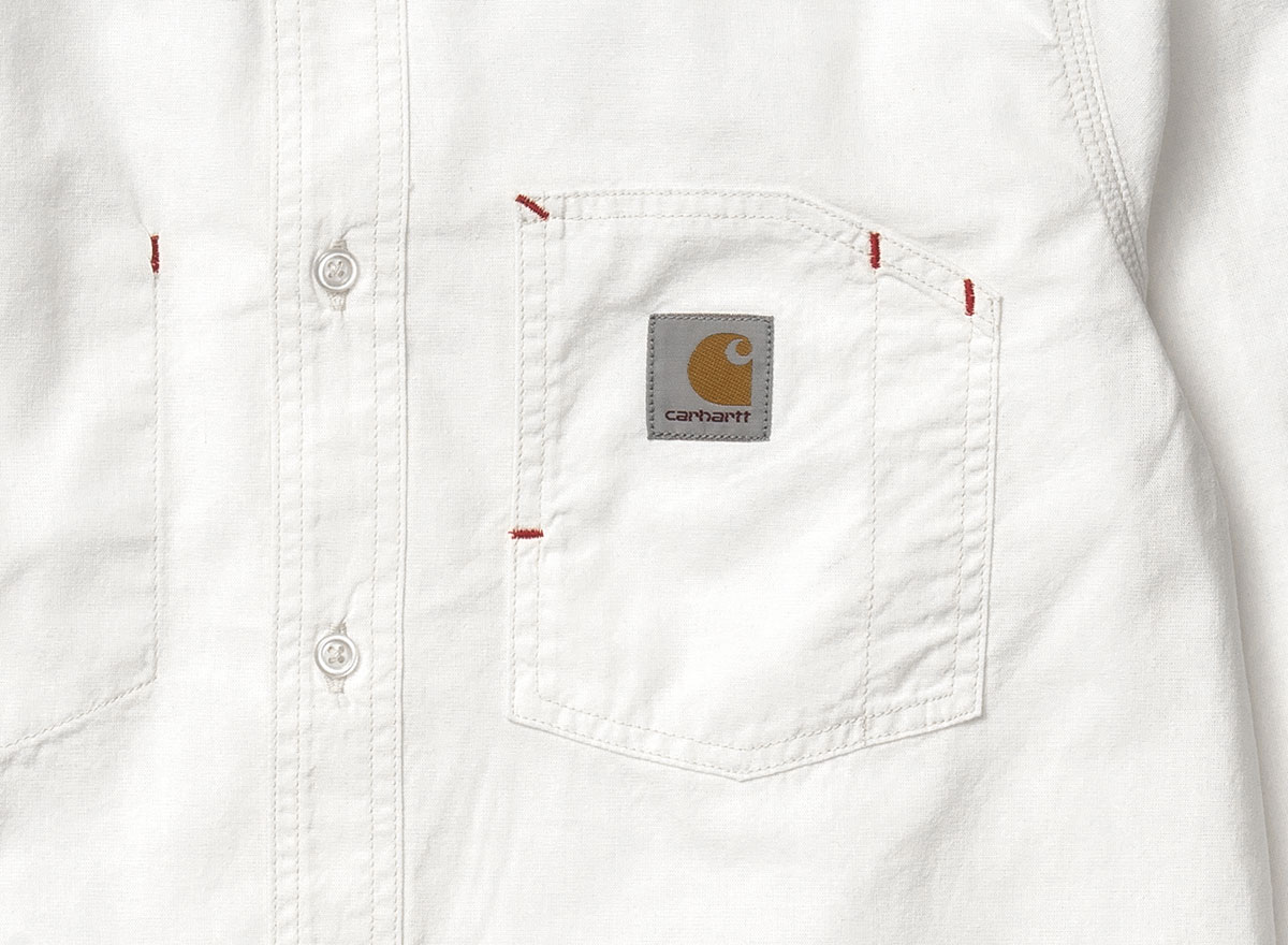 CARHARTT WIP State Shirt White I022964. Chemise d'inspiration Workwear en chambray 100% coton 4,5oz. Coupe droite. Poches poitrine. Poche intérieure. Détails de surpiqure rouges. Poignets boutonnés. Découpe arrondie sur le bas.