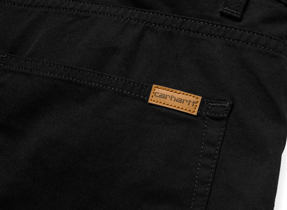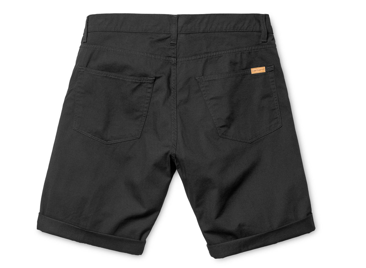 CARHARTT WIP Swell Short Black. Short 5 poches coupe regular en twill 97% coton / 3% Lycra. Braguette zippée. Empiècement dos. Rivets métal ou renforts aux endroits particulièrement sollicités. Étiquette Script en cuir.