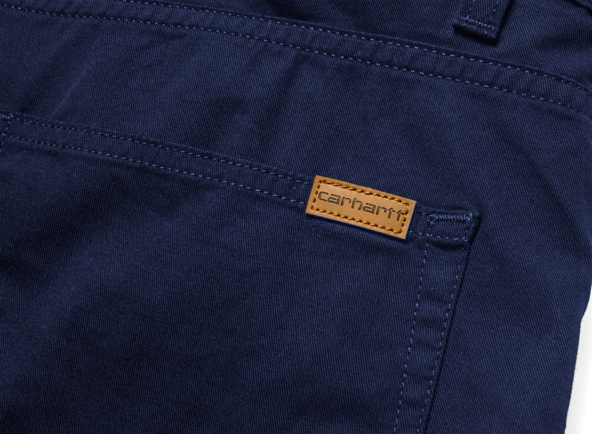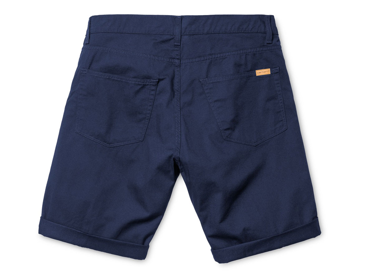 CARHARTT WIP Swell Short Blue. Short 5 poches coupe regular en twill 97% coton / 3% Lycra. Braguette zippée. Empiècement dos. Rivets métal ou renforts aux endroits particulièrement sollicités. Étiquette Script en cuir.