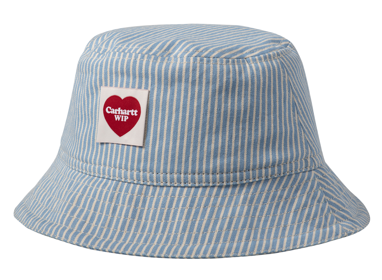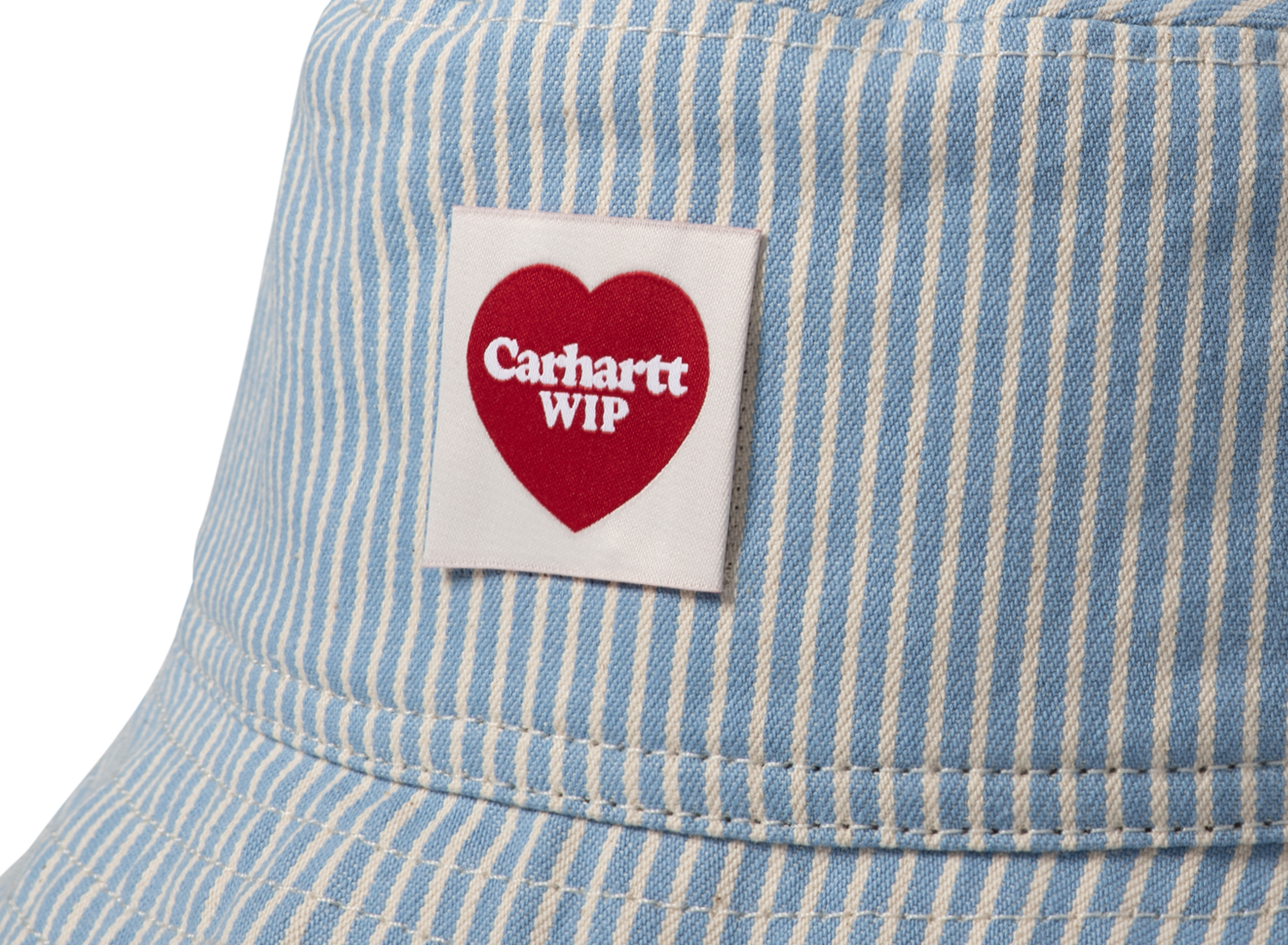 CARHARTT WIP Terrell Bucket Hat Bleach / Wax I032116. Bob en denim Hickory 100% coton. Logo coeur sur l'avant. S/M : 56 cm. M/L : 58 cm. L/XL : 60 cm.