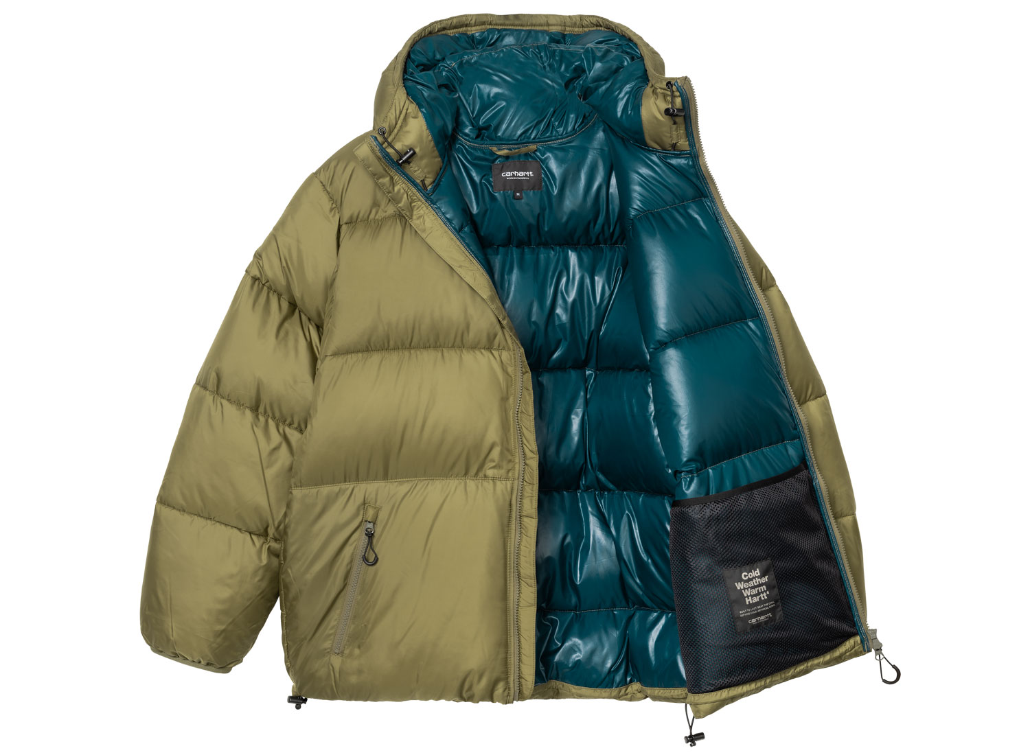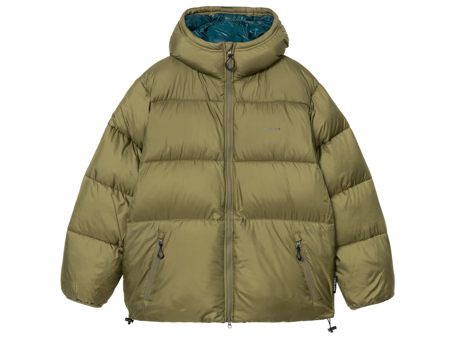 CARHARTT WIP Toronto Jacket Capulet / Duck Blue I033920. Doudoune confectionnée en ripstop de polyester léger. Tissu déperlant 100 % polyester. Rembourrage en duvet artificiel. Bas et capuche ajustables. Fermeture avant zippé à double sens. Deux poches avant zippées. Flag Label.