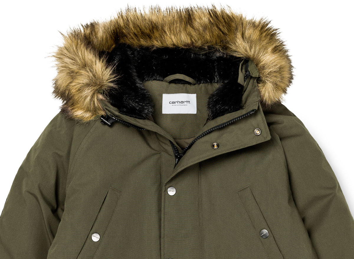CARHARTT WIP Trapper Parka Cypress. Très belle parka composée de 65% de polyester et de 35% de coton. Tissu hydrofuge enduit. Doublure en taffetas de nylon. Capuche ajustable fourrée avec bordure en fourrure amovible. Taille et bas ajustables. Poignets coupe-vent côtelés. Empiècements en velours côtelé aux coudes. Étiquette carrée en cuir.