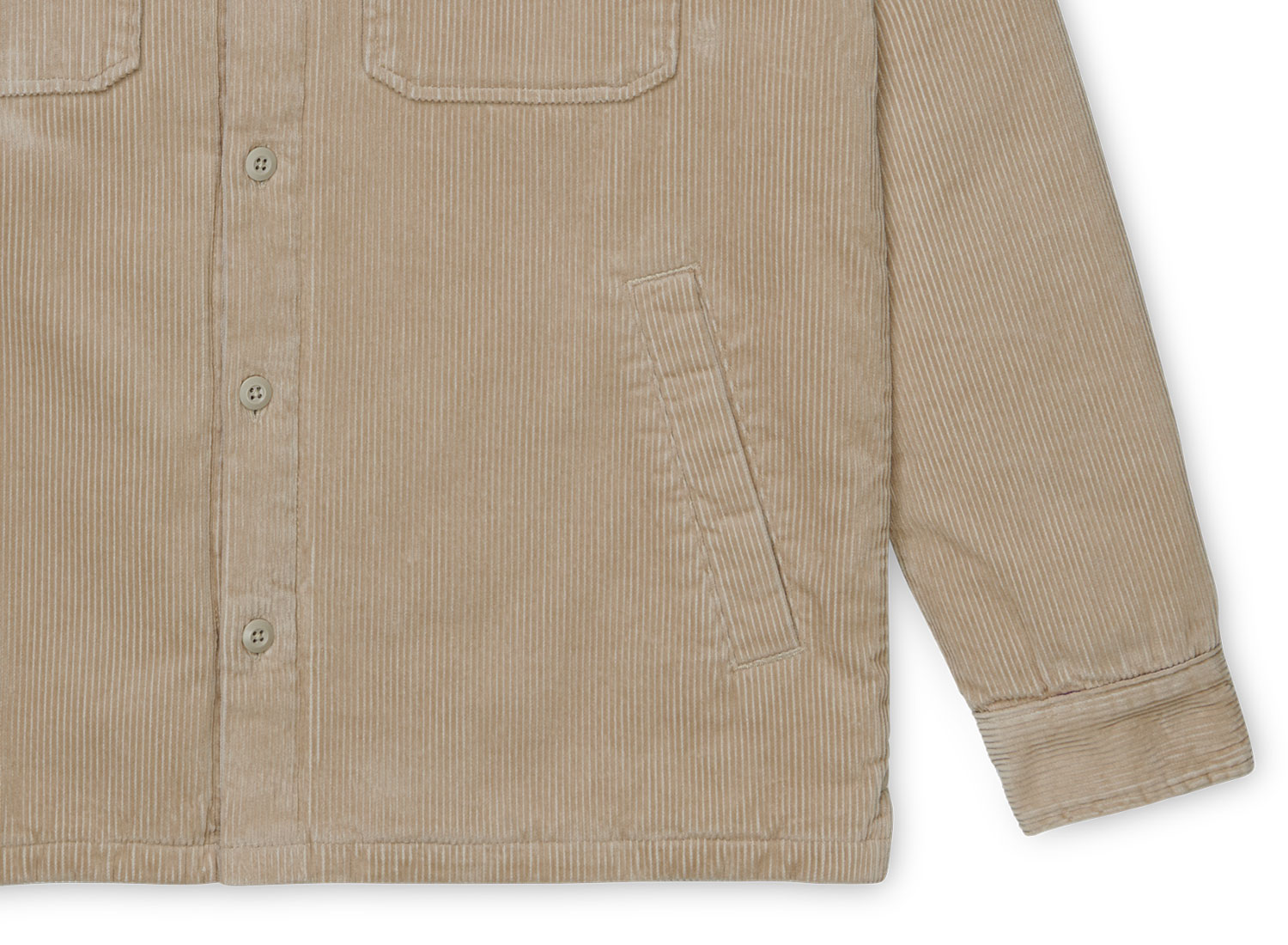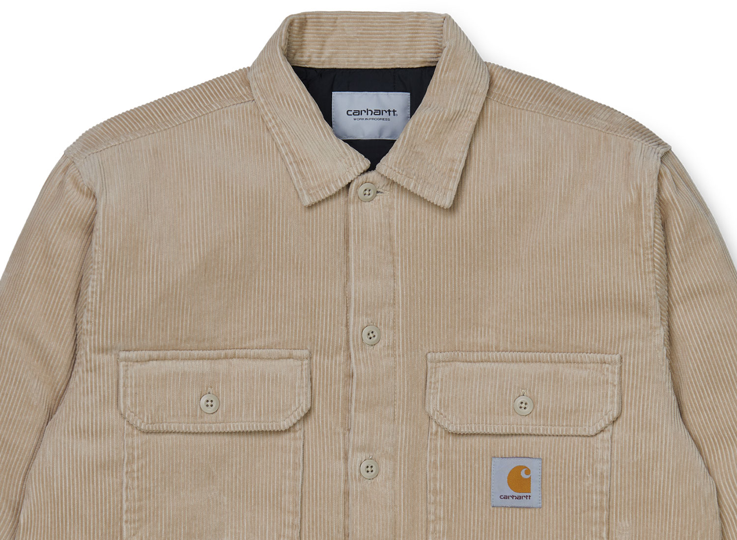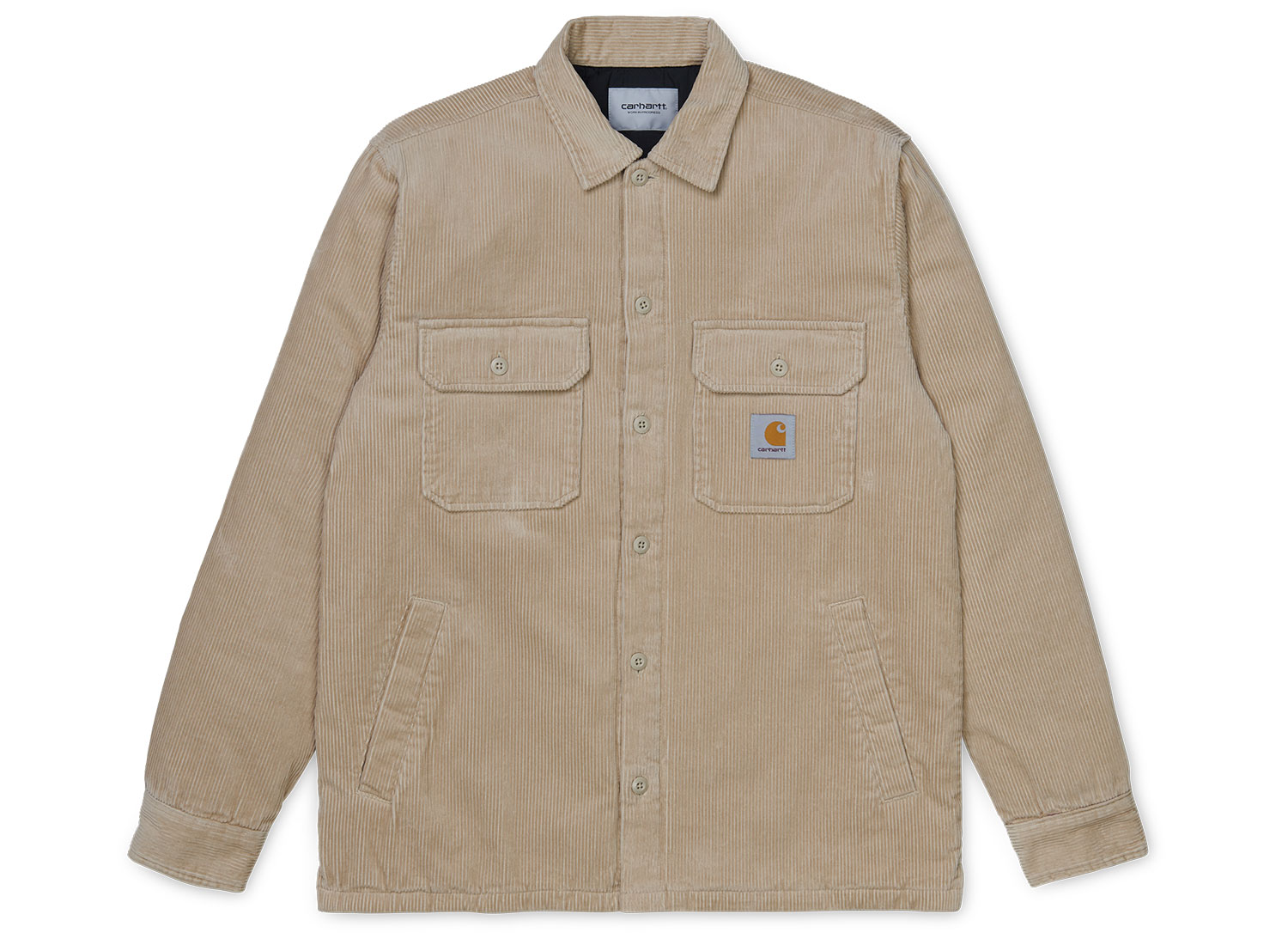 CARHARTT WIP Whitesome Shirt Jac Wall I028827. Veste mi-saison d'inspiration workwear en velours côtelé délavé. 100 % coton. Doublure en nylon. Deux poches sur la poitrine. Deux poches passepoilées sur les côtés. Etiquette carrée "Carhartt" sur la poitrine.