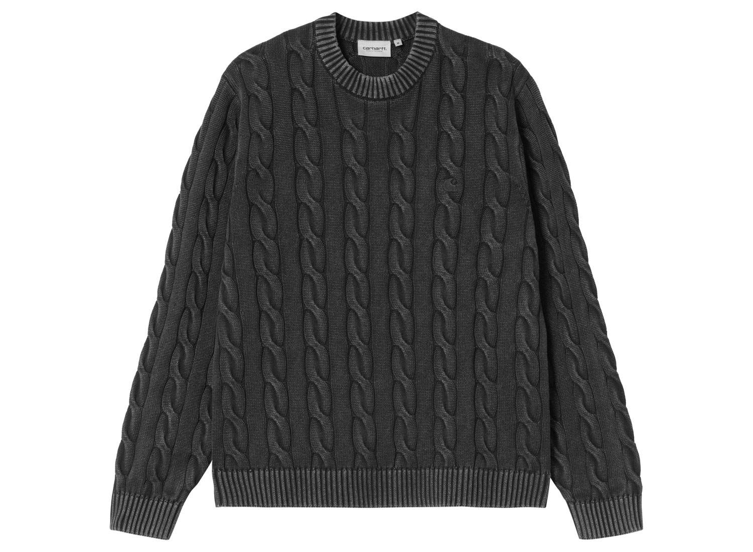 CARHARTT WIP Carter Sweater Cotton Black Garment Dyed I035179. Pull confectionné en tricot torsadé de coton semi-épais. 100 % coton. Tissu teint après confection. Logo « C » brodé sur la poitrine.