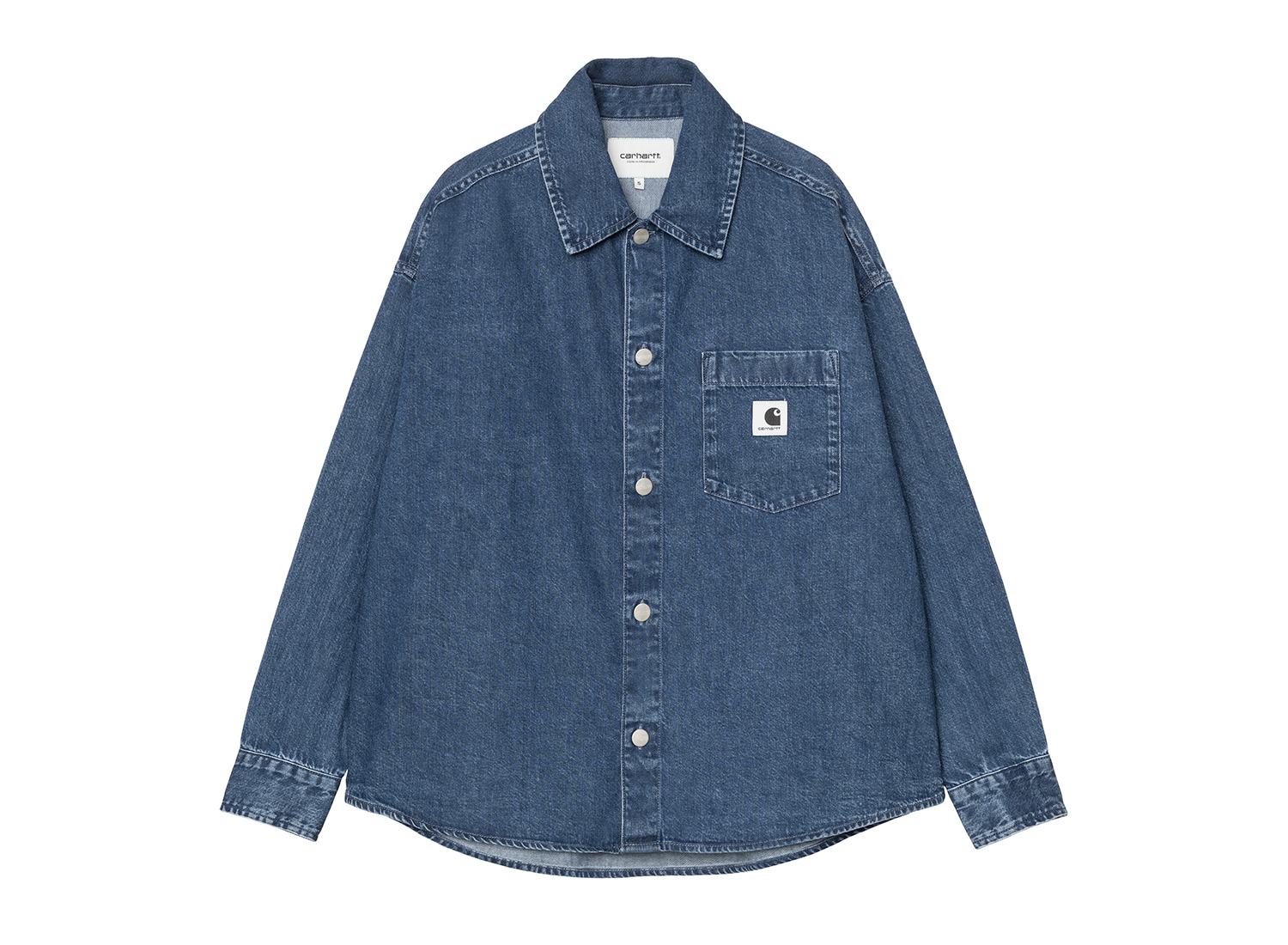 CARHARTT WIP Femme Alta Shirt Jac Cotton Denim Blue Stone Washed I036232. Veste-chemise pour femme confectionnée en denim de coton semi épais. 100 % coton (Denim Olympia). Non doublée. Boutons métalliques. Poche poitrine. Square Label.