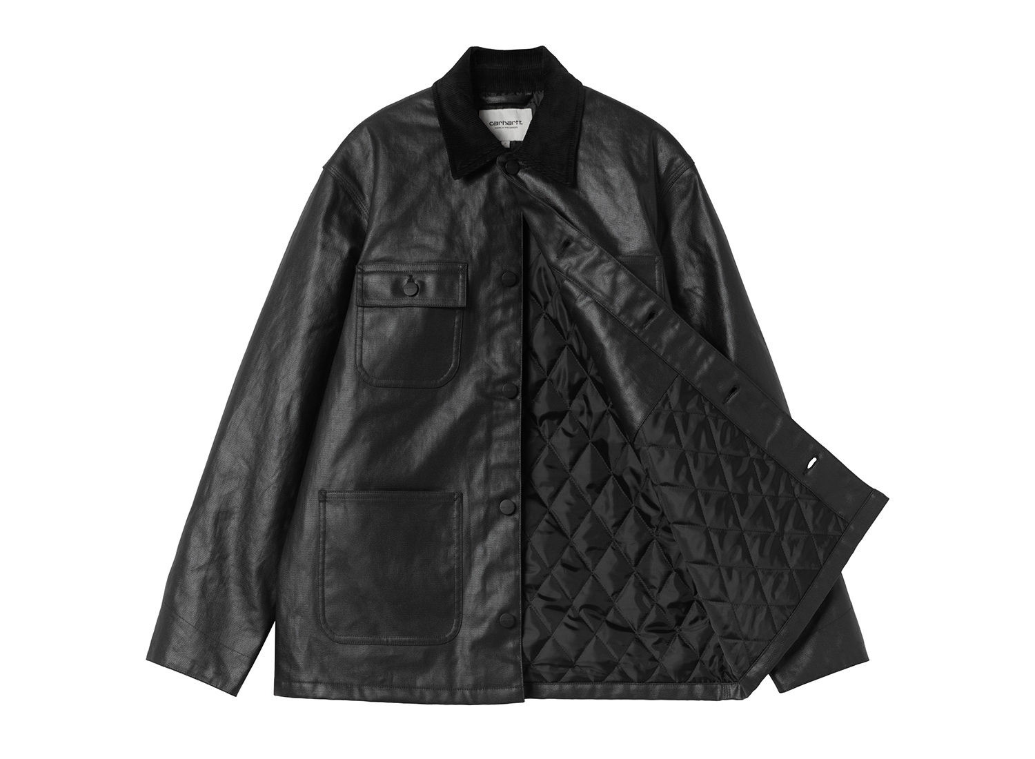 CARHARTT WIP Femme Dean Michigan Jacket Black I035800_89_XX_03. Veste pour femme en toile de coton épaisse. 100 % coton. Doublure matelassée 100 % nylon. Col en velours côtelé. Quatre poches, dont une à rabat boutonné. Poignets ajustables avec boutons-pression siglés Poche poitrine intérieure. Fermeture boutonnée. Square Label.