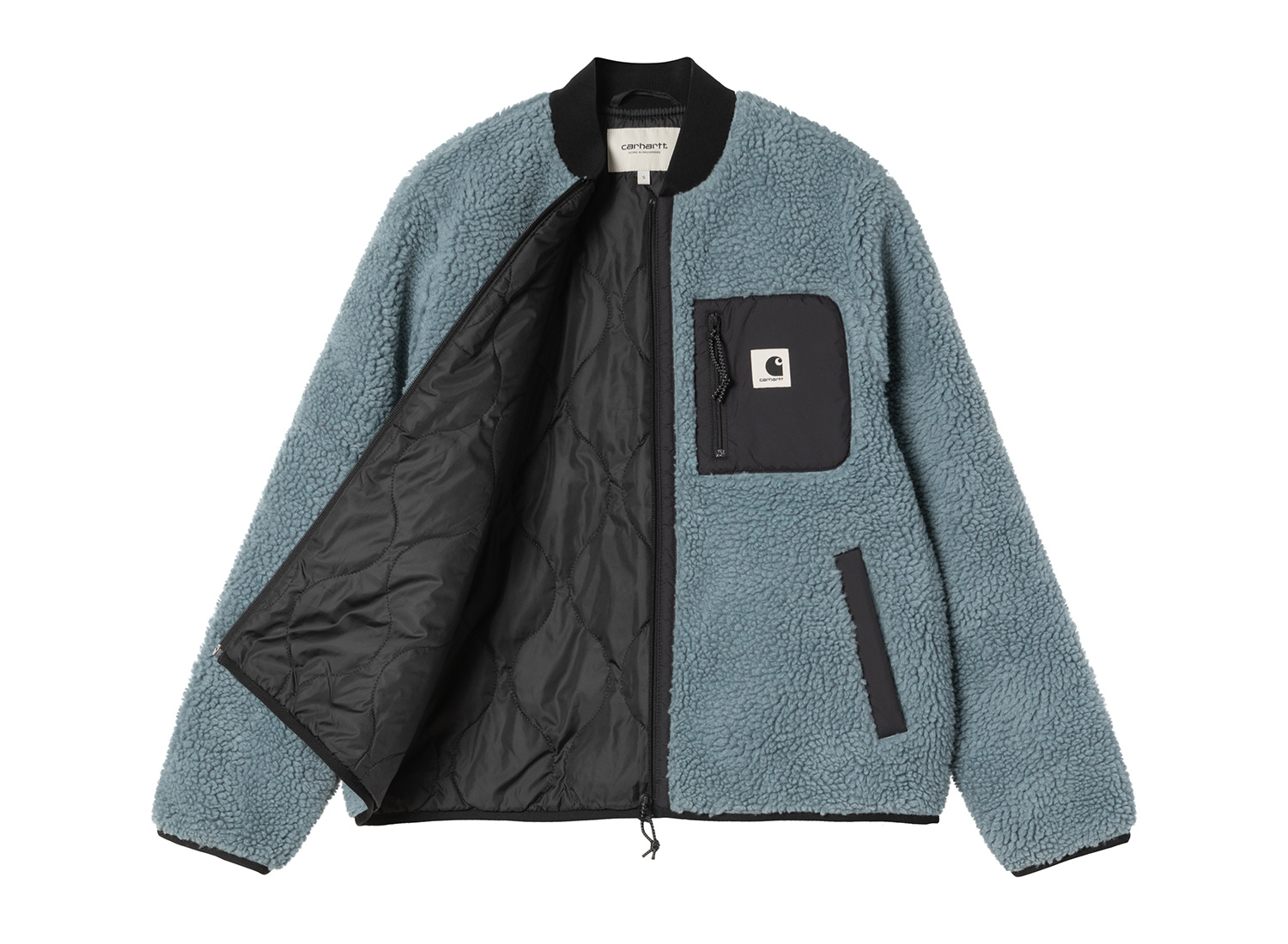 CARHARTT WIP Femme Janet Liner Citadel / Black I035697_3B7_XX_03. Liner pour femme en polaire épaisse 100% polyester. Doublure en taffetas de nylon. Détails contrastants en taffetas de nylon. Col en maille côtelée. Fermeture zippée sur le devant. Poches latérales et poche poitrine zippée. Square Label tissé.
