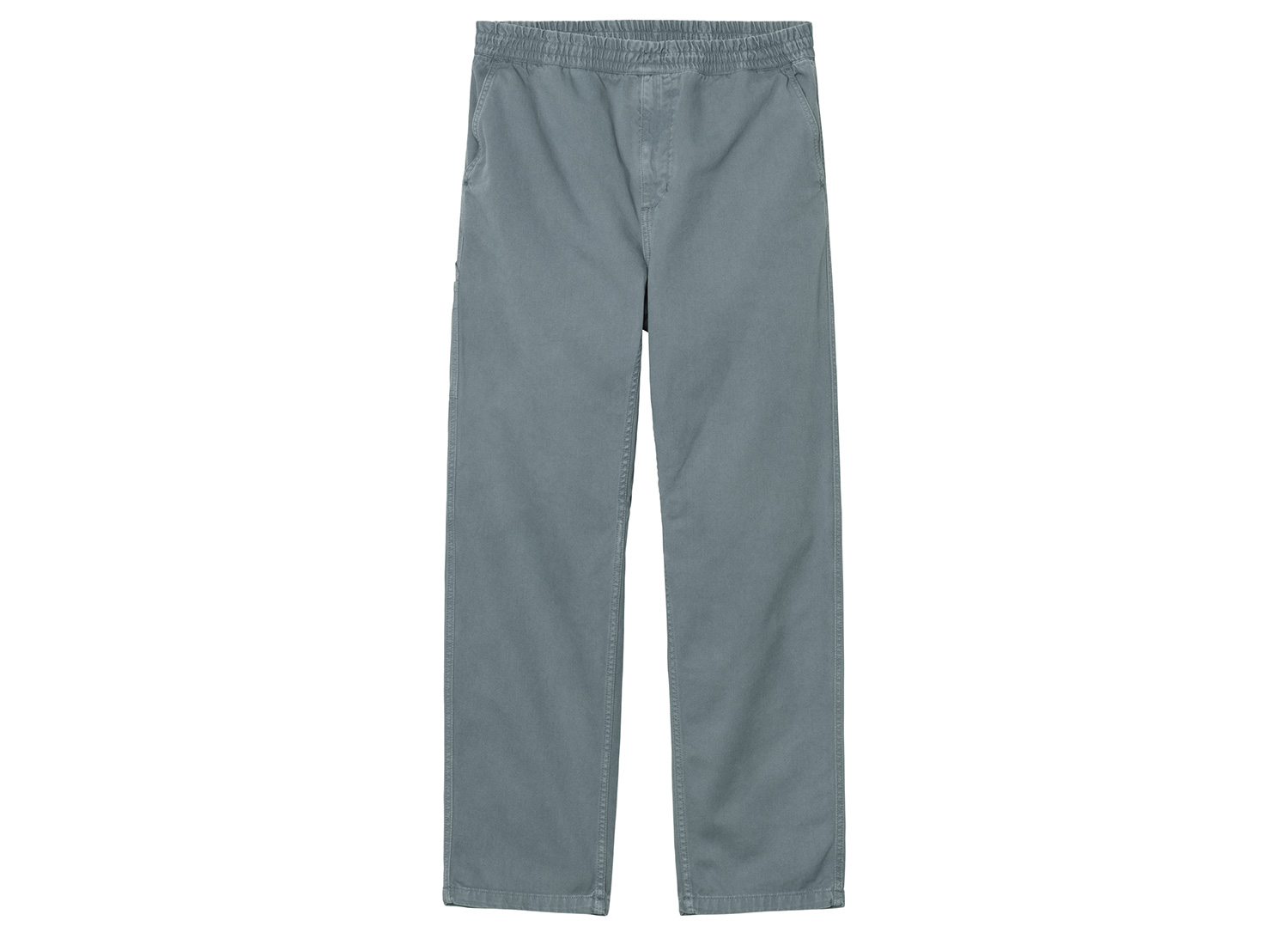CARHARTT WIP Flint Pant Twill Cozy Blue Garment Dyed I029919. Pantalon coupe carotte confectionné en coton biologique d’épaisseur moyenne. 100 % coton (Moraga Twill, 8.25 oz). Taille élastique avec cordon de serrage. Tissu teint. Braguette zippée. Poches côtés. Poches plaquées au dos. Petites poches façon painter.