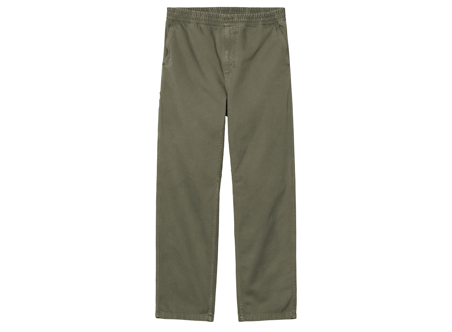 CARHARTT WIP Flint Pant Twill Leaf Garment Dyed I029919. Pantalon coupe carotte confectionné en coton biologique d’épaisseur moyenne. 100 % coton (Moraga Twill, 8.25 oz). Taille élastique avec cordon de serrage. Tissu teint. Braguette zippée. Poches côtés. Poches plaquées au dos. Petites poches façon painter.