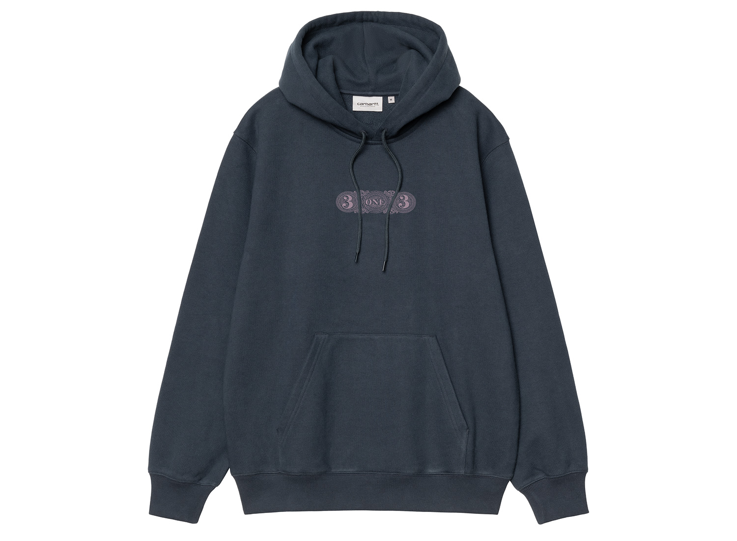 CARHARTT WIP Hooded 3 One 3 Sweat Deep Night I035645_J0_XX_03. Sweat à capuche en jersey polycoton épais (87% coton, 13% polyester). Coupe loose. Capuche ajustable. Poche kangourou. Impressions graphiques sur la poitrine et dans le dos. Bords-côtes aux poignets et sur le bas.