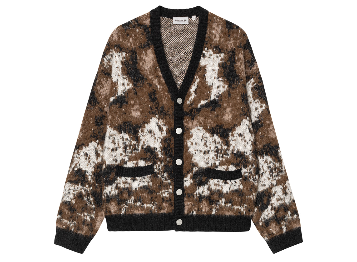 CARHARTT WIP Merton Cardigan Wild Dog Jacquard I035391_38X_XX_03. Cardigan tricoté à partir d'un mélange de fibres naturelles et synthétiques semi-épaisses. 30 % alpaga, 30 % nylon, 40 % acrylique. Motif camouflage allover en Jacquard. Boutons métalliques siglés. Flag Label.