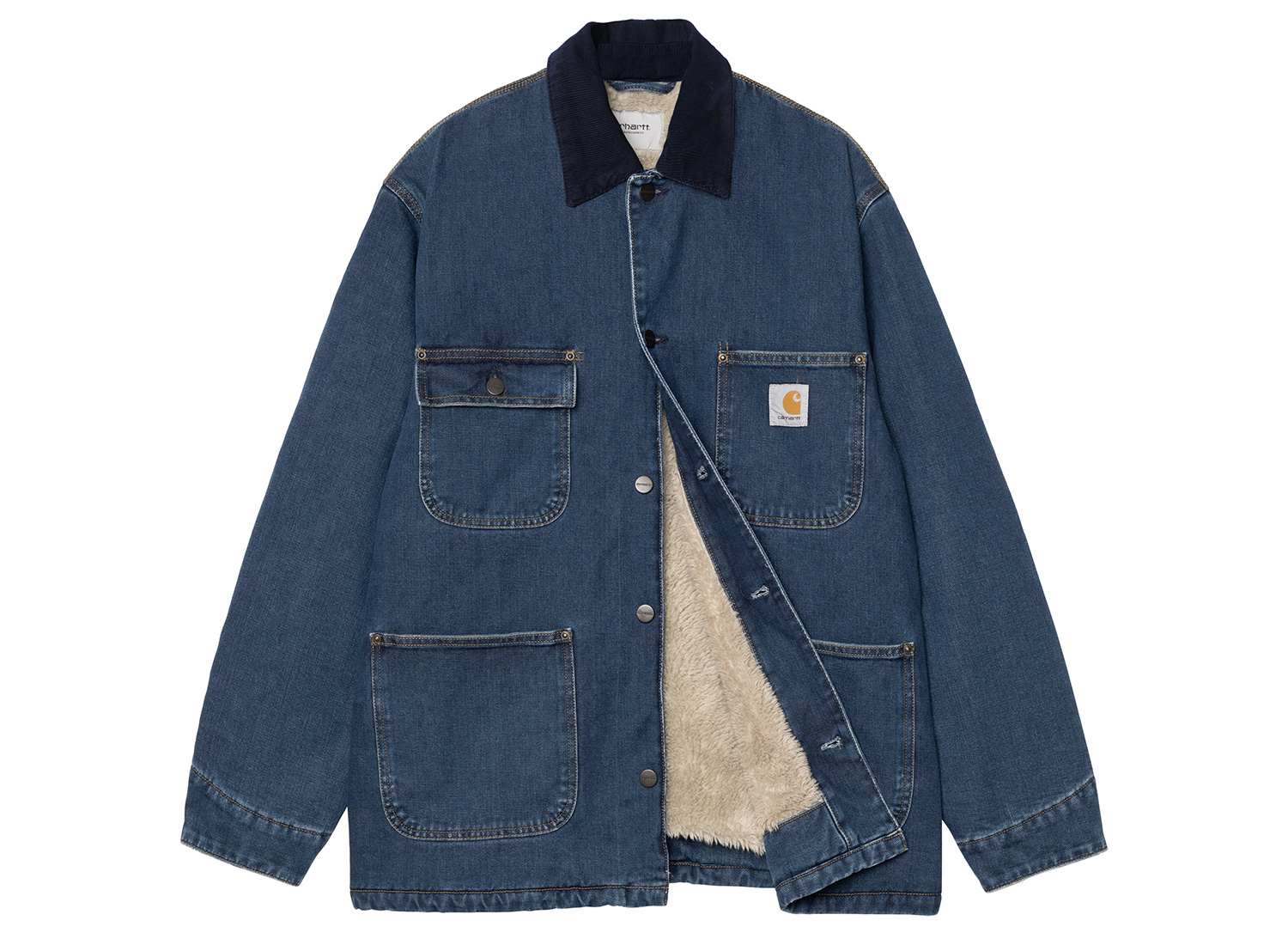 CARHARTT WIP OG Chore Coat Blue / Dark Navy Stone Washed I035877.453.06.03. Veste iconique du label CARHARTT, la Chore Jacket est confectionnée en toile de coton épais (Dearborn Canvas, biologique). Doublure en sherpa polyester. Coupe ample originale. Col en velours côtelé. Fermeture boutonnée sur l'avant. 4 poches plaquées dont une à rabat boutonné sur l'avant. Boutons siglés. Poignets ajustables. Square label.