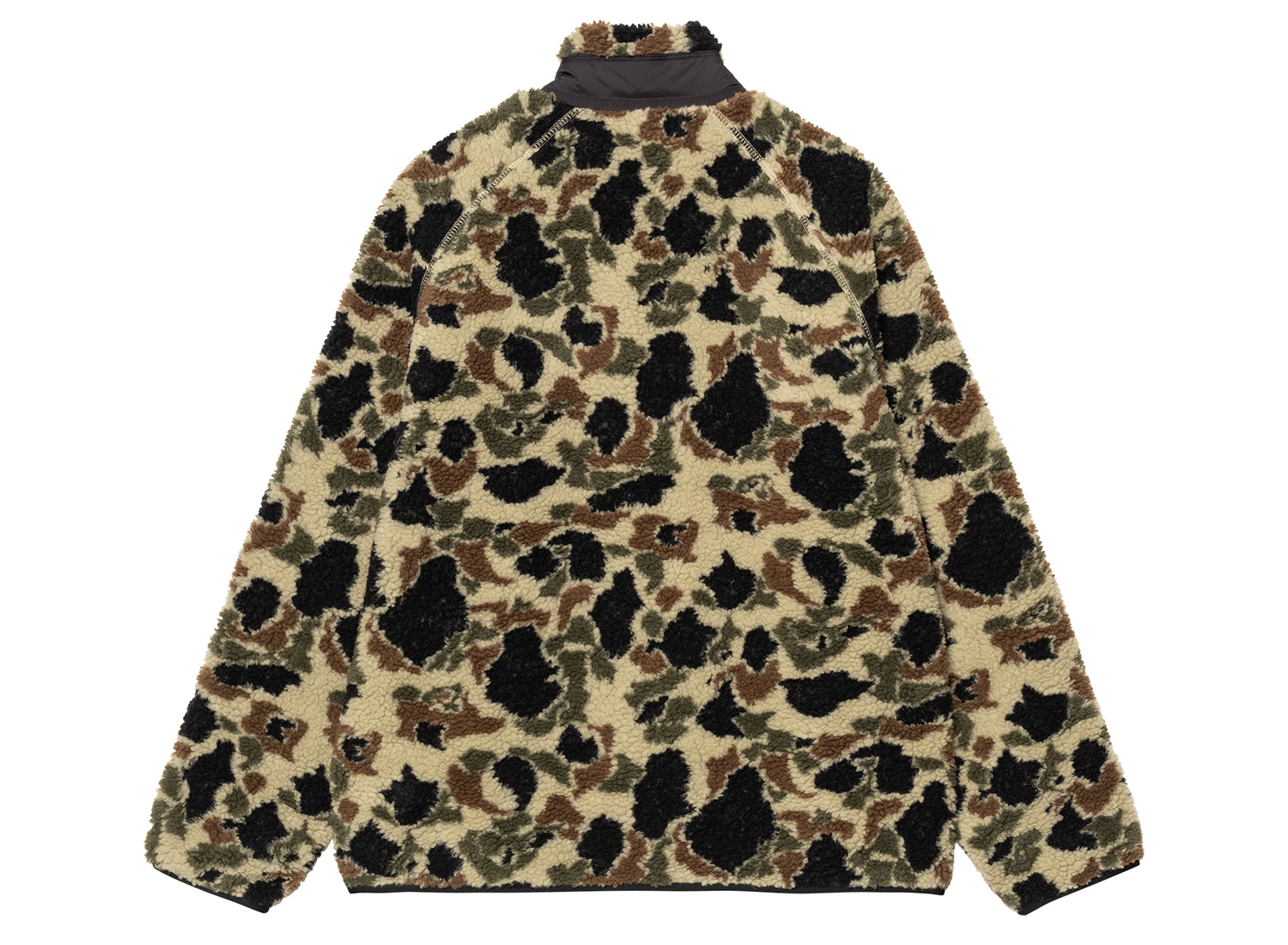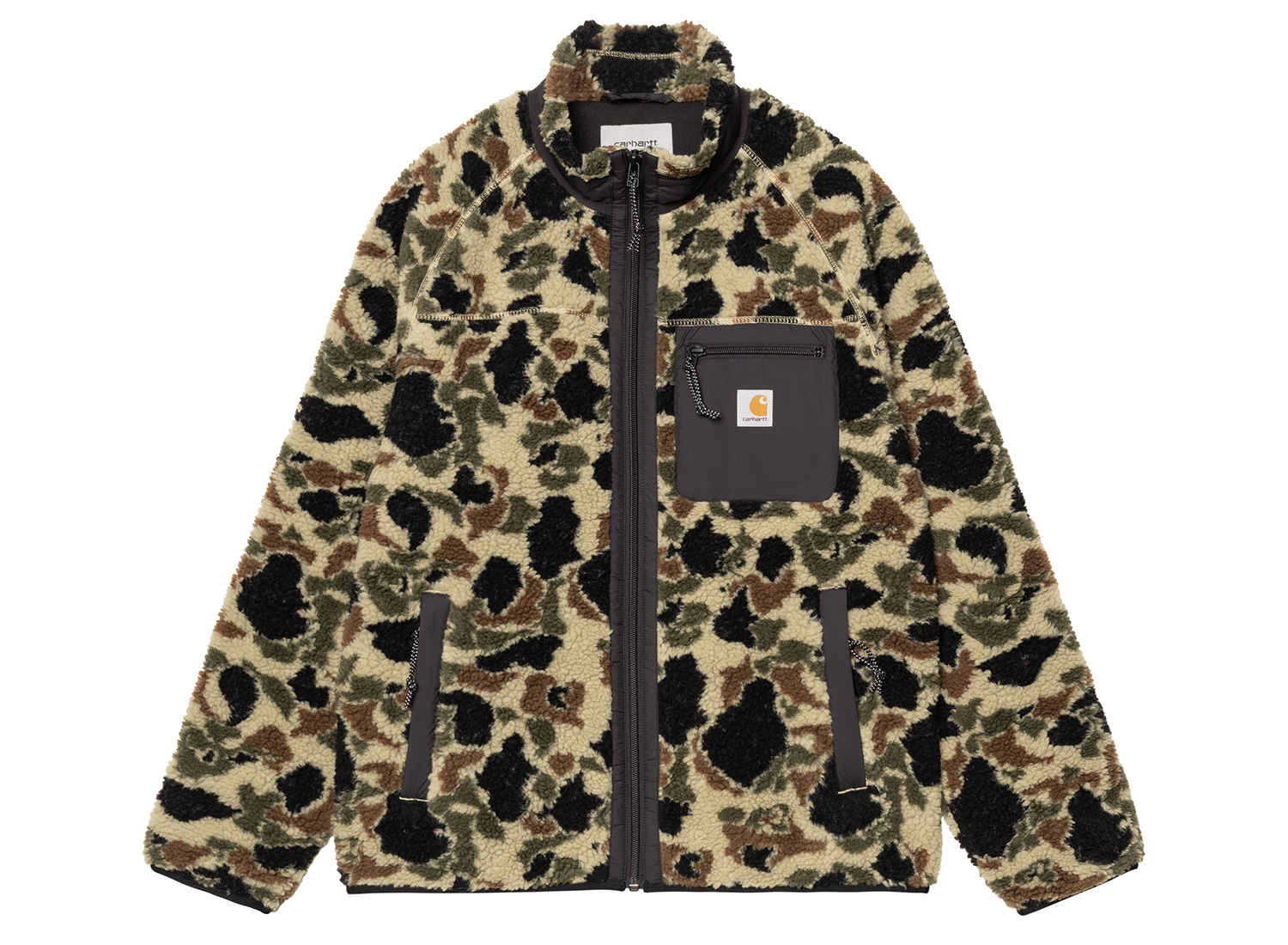 CARHARTT WIP Prentis Liner Camo Duck Jacquard Green I035696.3CV.XX.03. Polaire épaisse 100 % polyester, 10,3 oz. Coupe droite. Doublure en filet. Détails en taffetas de nylon. Fermeture à l'avant, poches latérales et poche de poitrine zippée. Étiquette carrée.