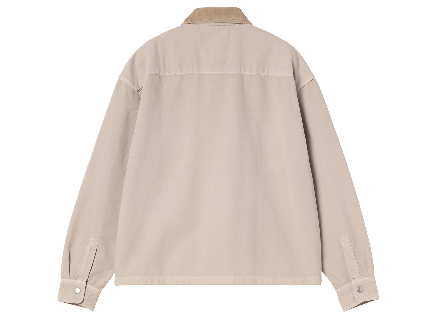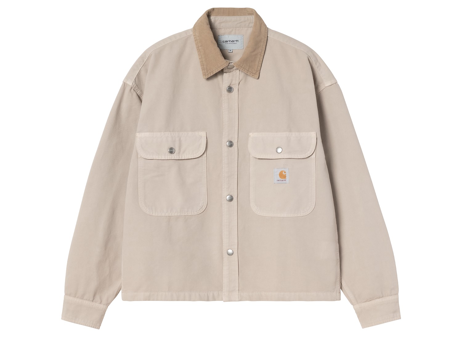Surchemise en toile de coton semi-épaisse. Tissu teint en pièce pour un toucher plus doux. Non doublé. Col en velours côtelé. Deux poches poitrine boutonnées. Square Label.