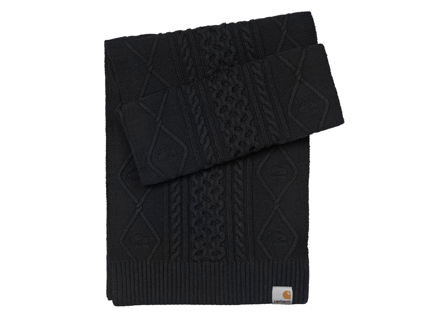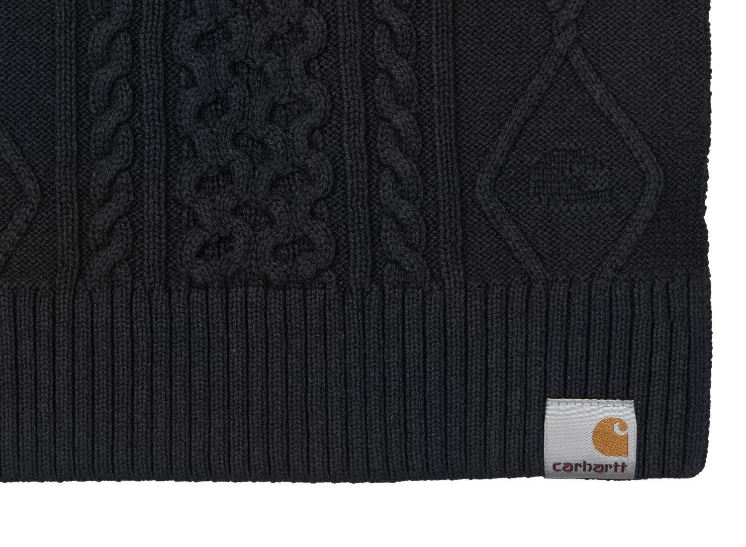 CARHARTT WIP Shawn Scarf Black I035474_89_XX_06. Écharpe en maille torsadée coton / acrylique. 60% coton, 40% acrylique (gauge 7). Dimensions : 175 × 30 cm. Square Label.