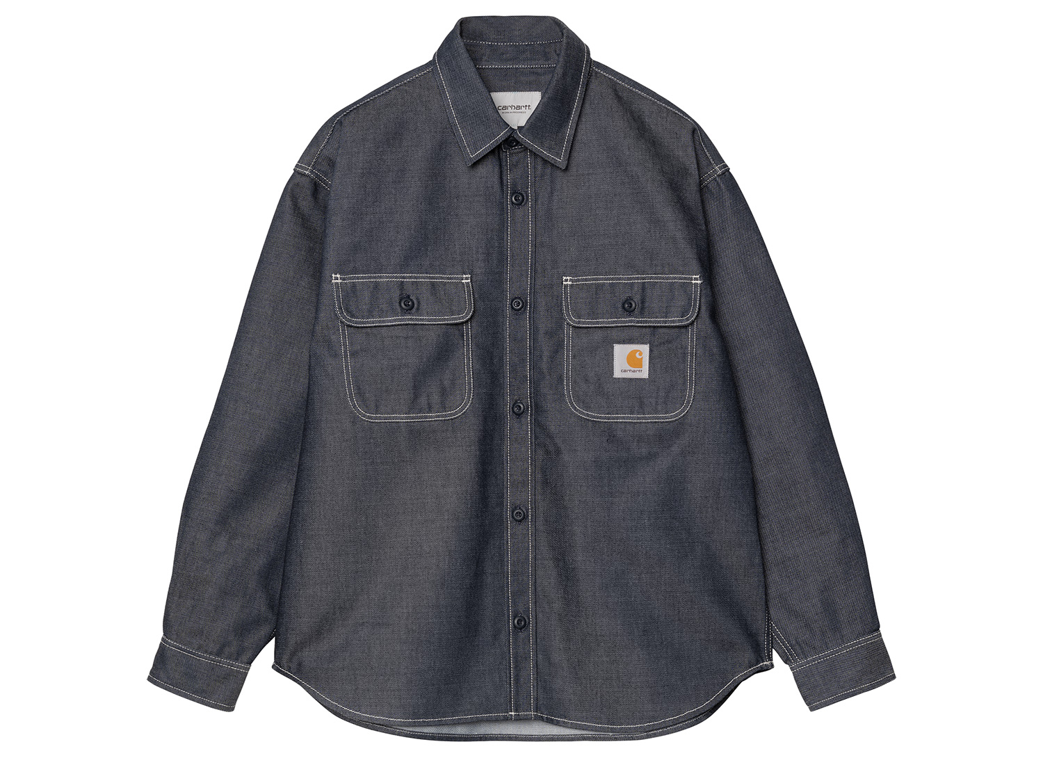 CARHARTT WIP Tigan Shirt Jac Blue Rigid I036263_01_01_03. Surchemise en denim épais polyester-coton. 50 % polyester, 50 % coton. Non doublée, fermeture boutonnée. Deux poches poitrine. Coutures renforcées pour plus de solidité. Square Label cousu.