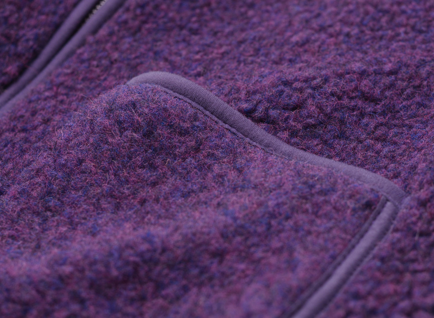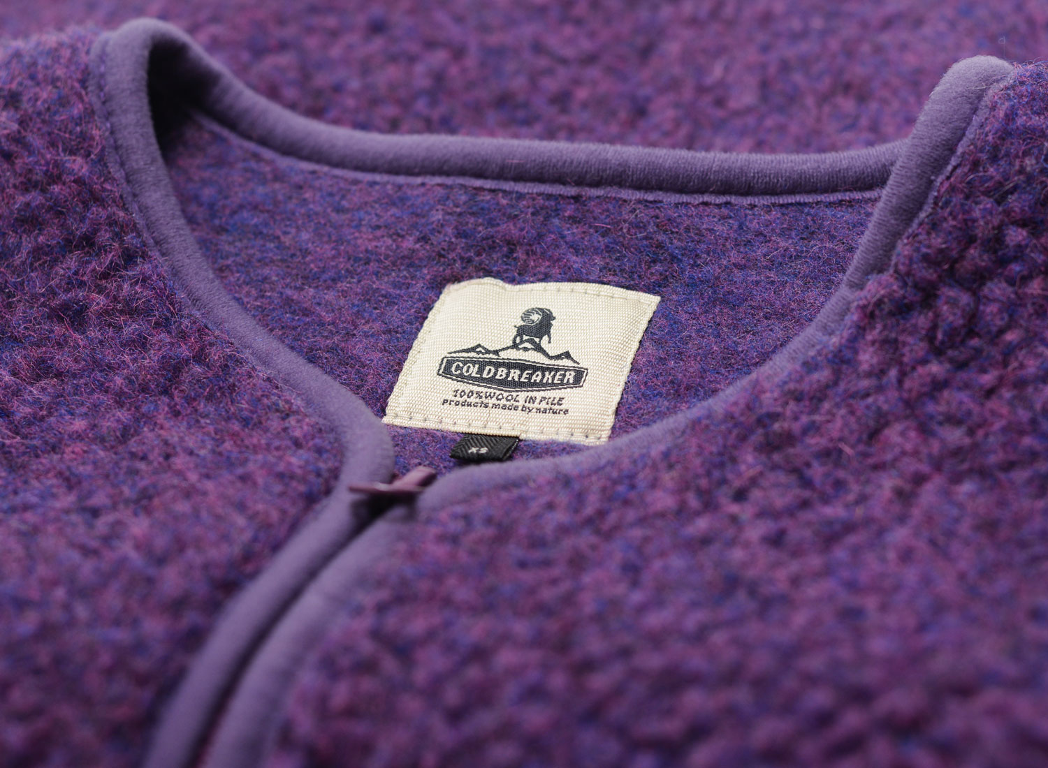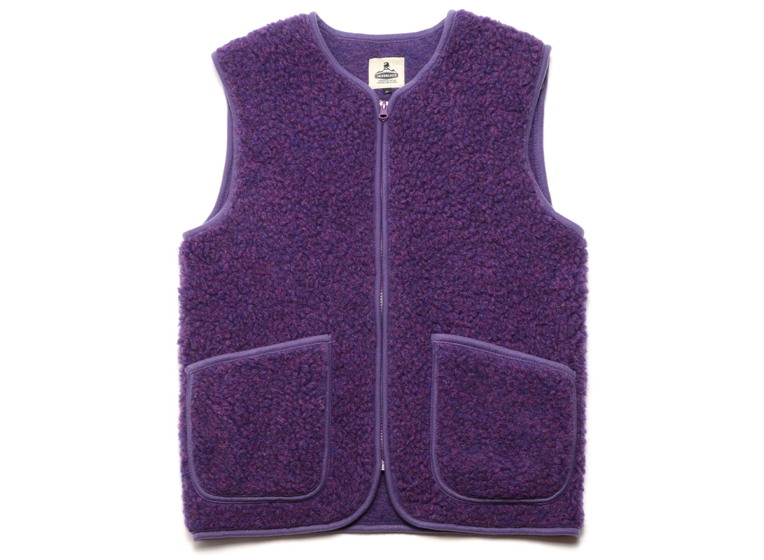 COLDBREAKER Vest Pepitko Violet. Gilet coupe droite confectionné dans une sherpa 100% laine de la maison Irlandaise YOKO spécialiste en la matière. Fermeture zippée. Poches plaquées sur le bas. Bords gansés. Ce gilet taille un peu petit, nous conseillons de prendre une taille au-dessus de de votre taille habituelle.