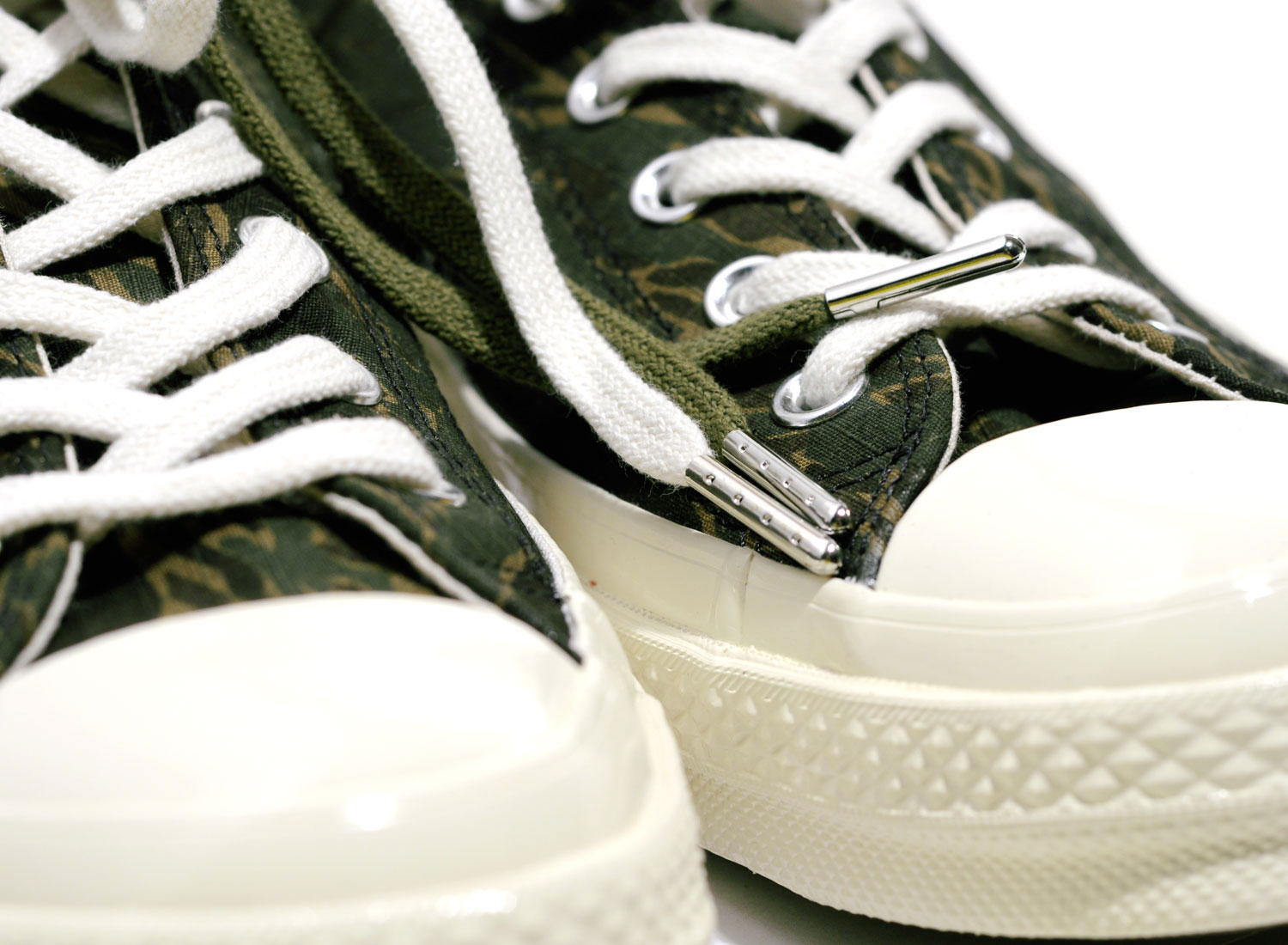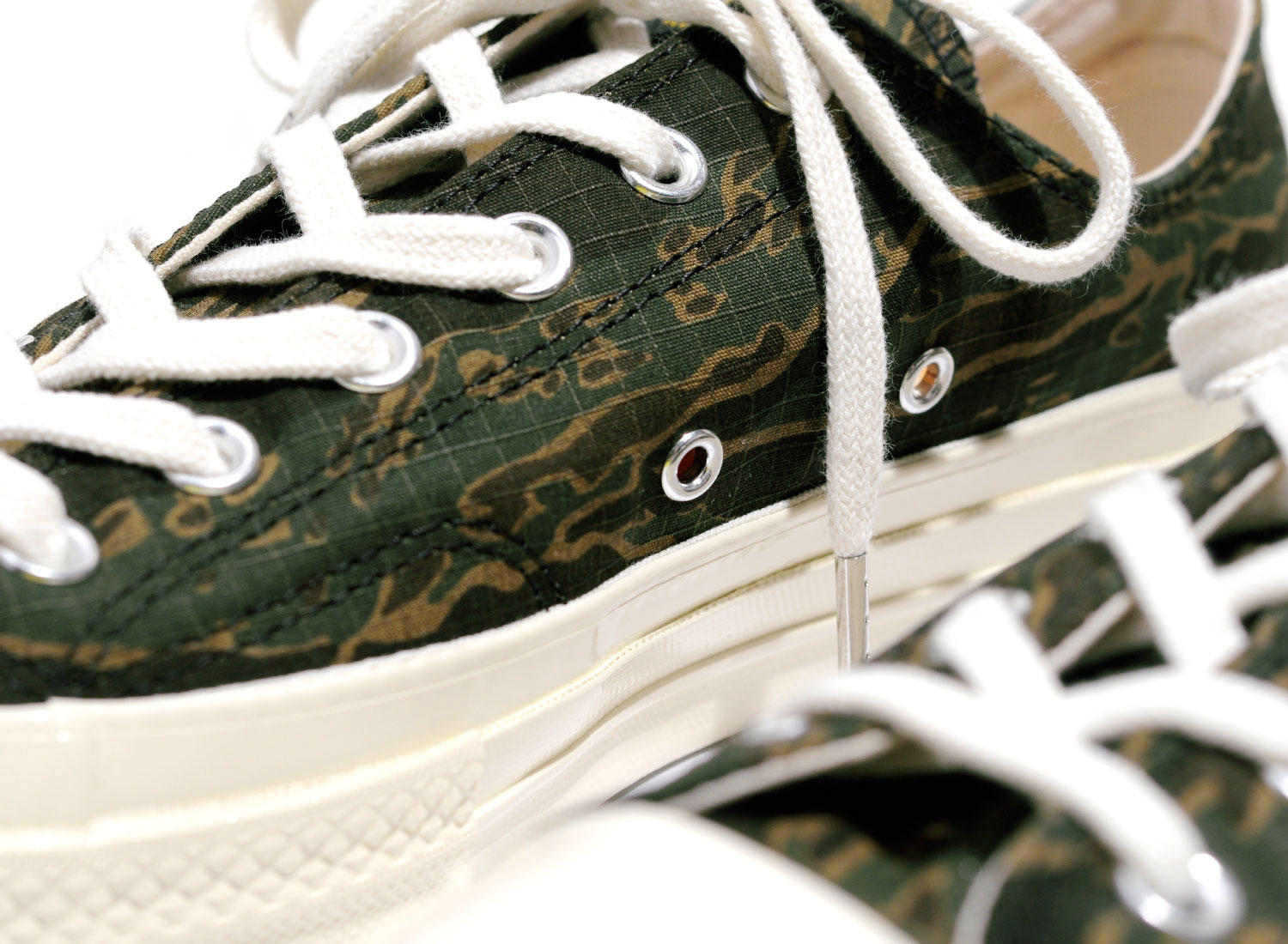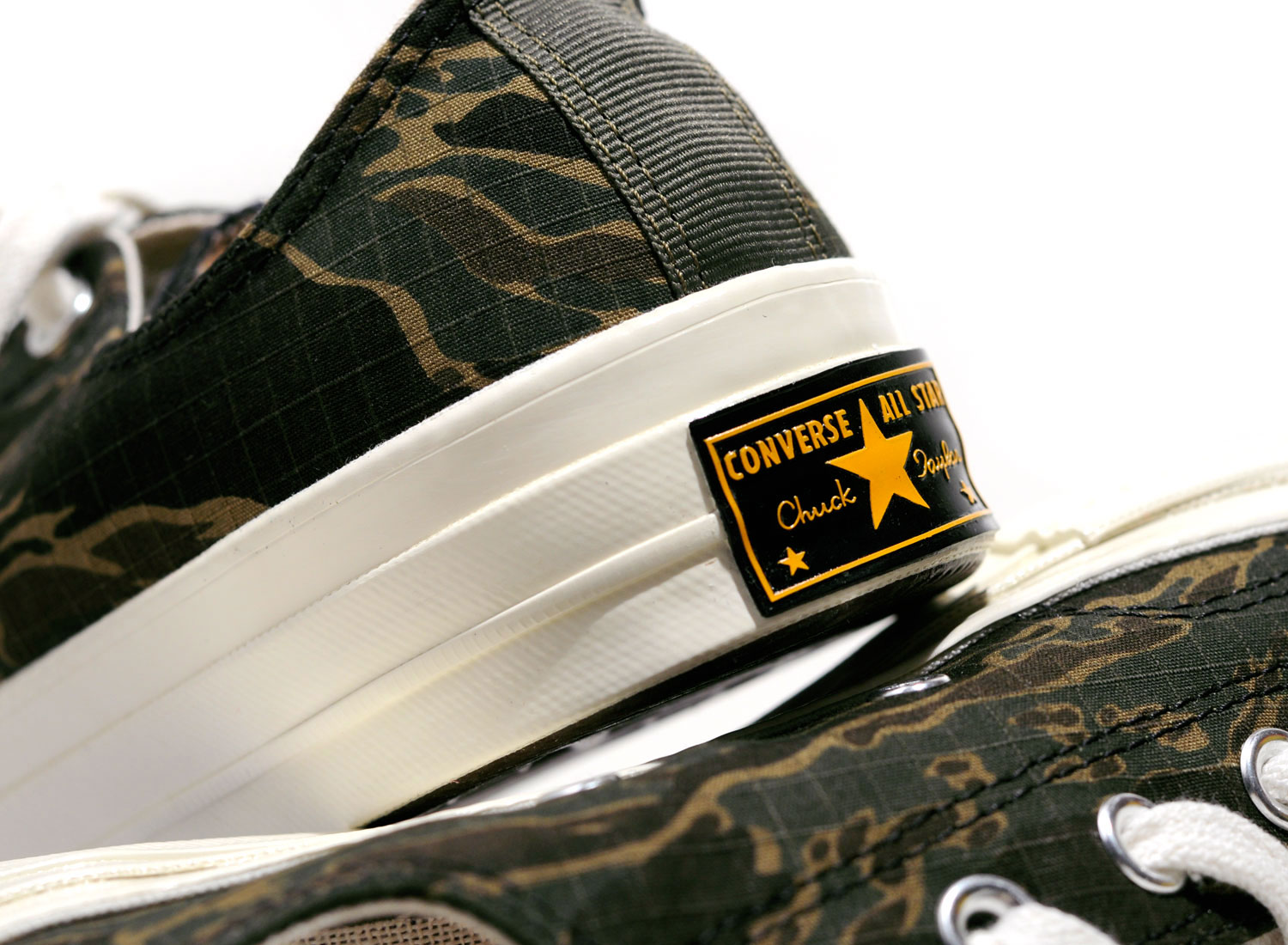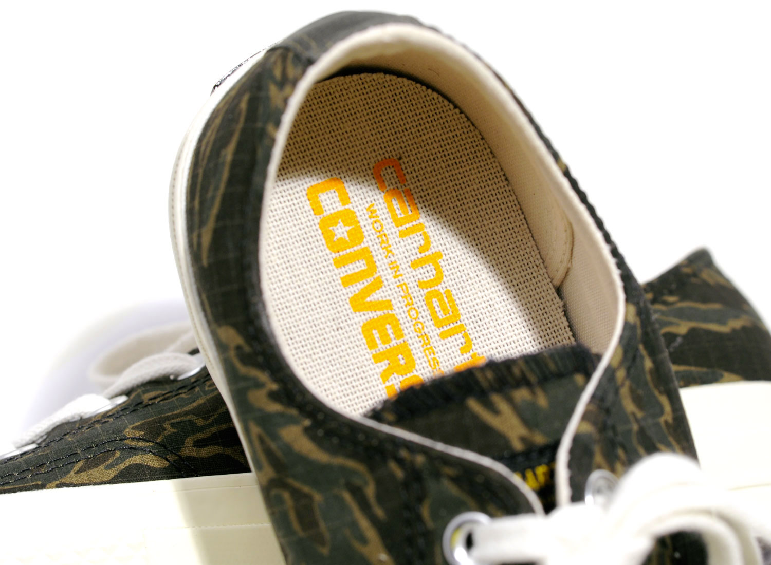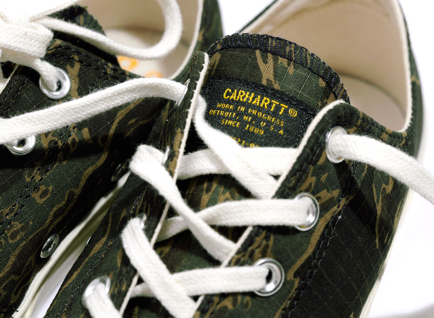 Très belle collaboration entre CONVERSE et le label CARHARTT WIP. Modèle Chuck Taylor All Star 70 OX en version Tiger Camo. Étiquette militaire sur la languette. Empiècement au talon. Oeillets en métal. Petit détail rouge sur la semelle. Deux paires de lacets. Branding intérieur spécial. Quantités limitées et distribution sélective.