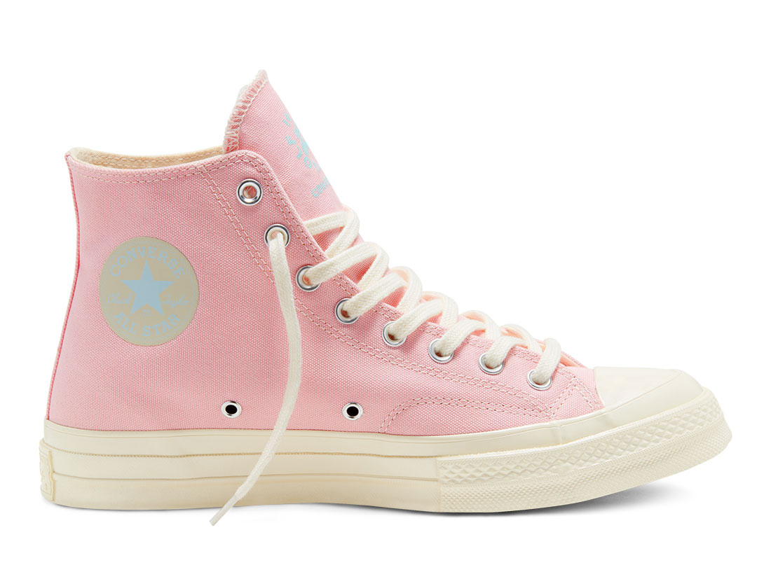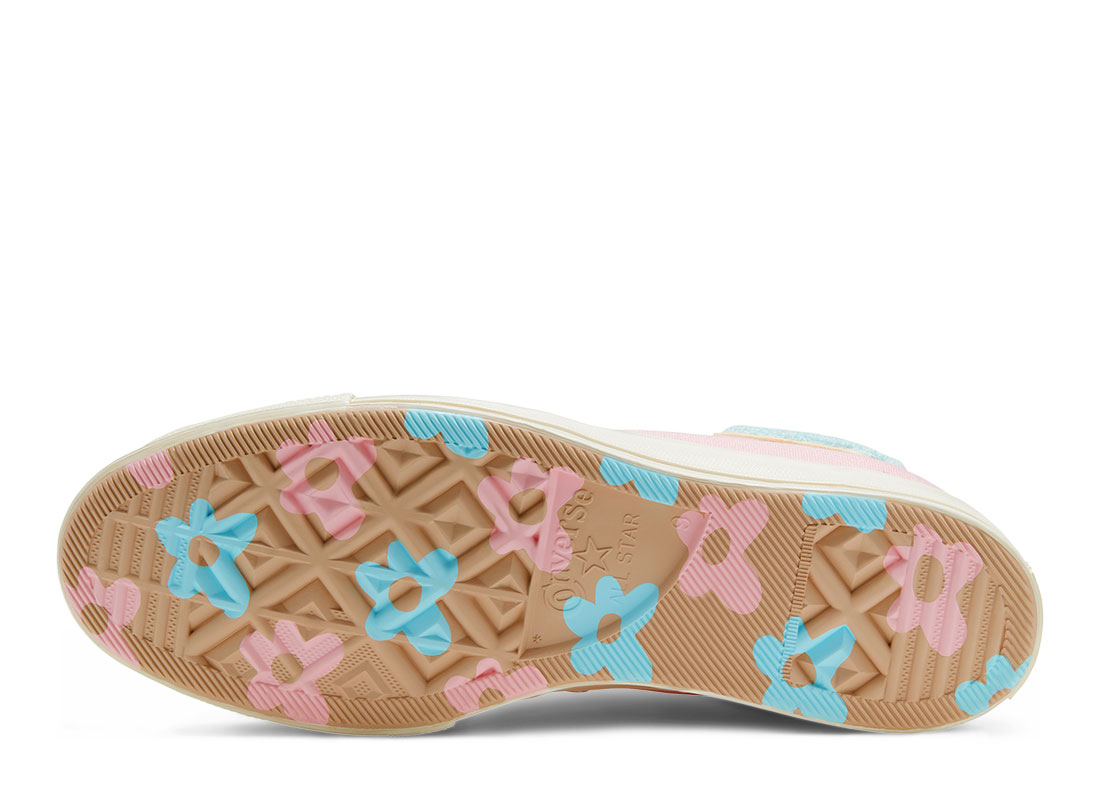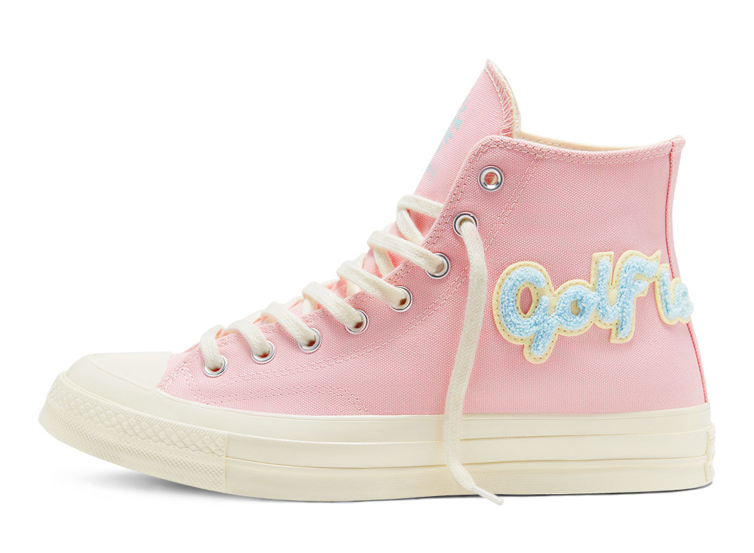 CONVERSE x Golf Le Fleur Chuck 70 Chenille 167478C. Nouvelle collaboration avec Tyler The Creator ! Chuck 70 Hi en canevas rose pale. Logo en bouclette sur chaque pieds. Deux paires de lacets. Quantités limitées.