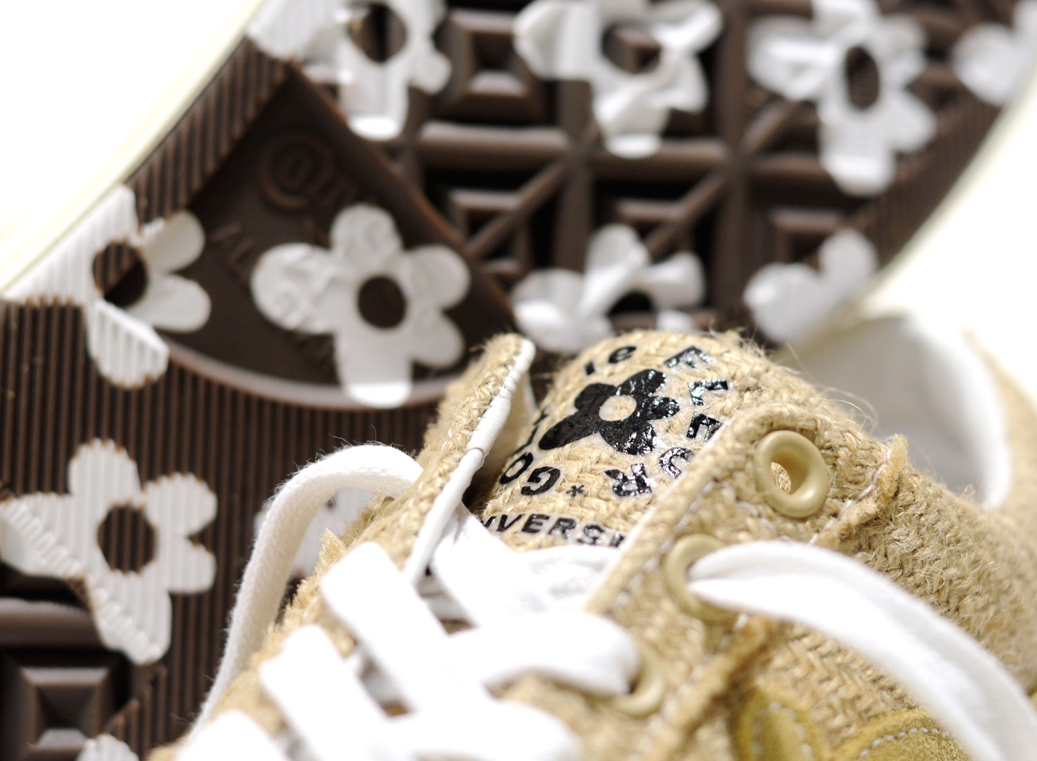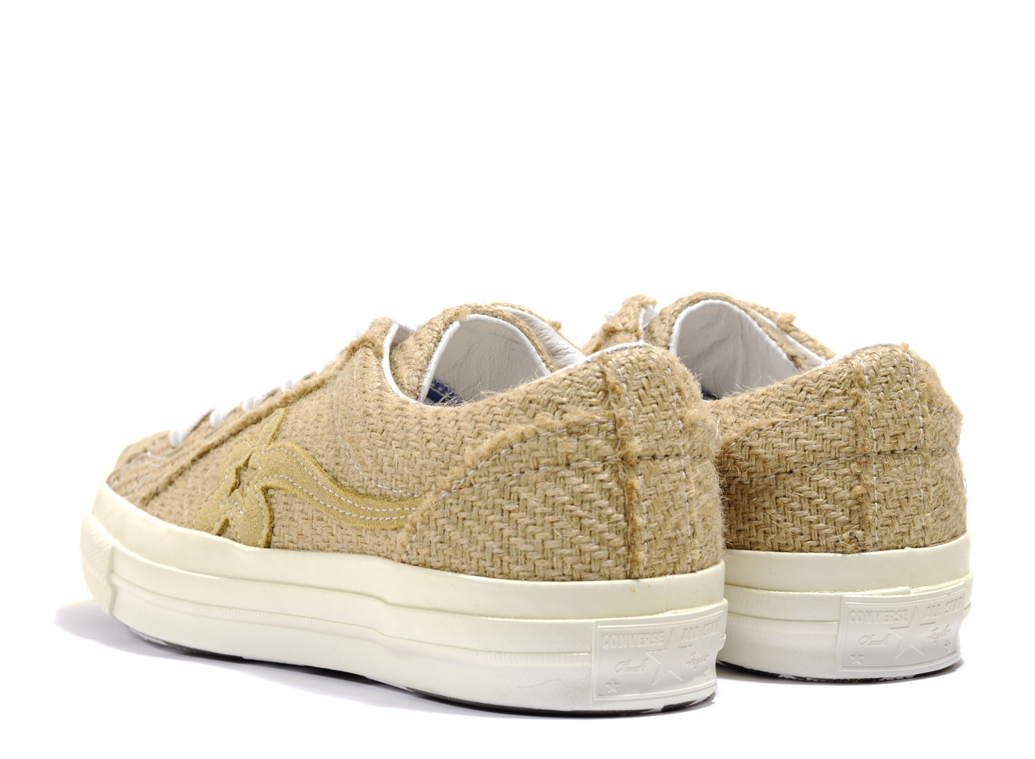 CONVERSE X GOLF LE FLEUR One Star Ox Curry 163169C. Très belle One Star faisant partie du pack "Burlap" en collaboration avec le rappeur TYLER THE CREATOR. Empeigne en toile de jute. 2 jeux de lacets. Dessous de semelle imprimée fleurs. Quantités très limitées.