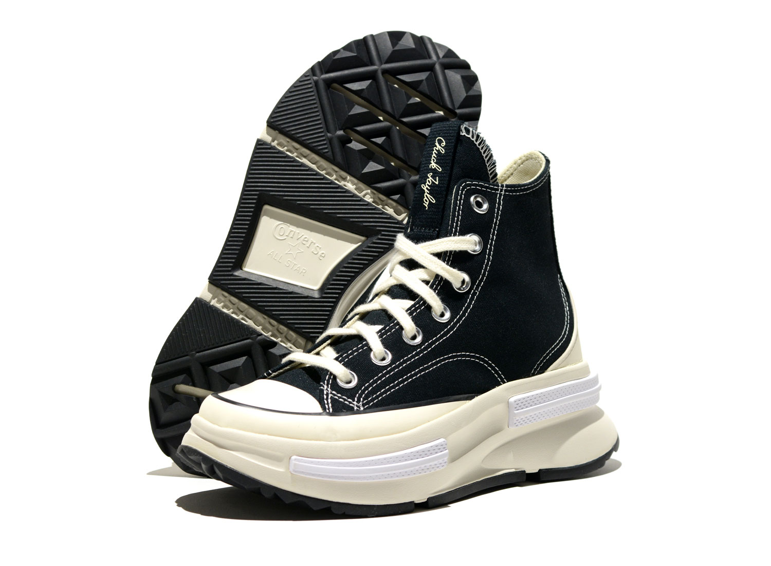 CONVERSE Run Star Legacy CX HI Black A00869C. Nouvelle version de la Chuck 70. Empeigne en canevas. Semelle compensée oversize et restructurée avec des sur empiècements. Oeillets en métal. Quantités limitées !