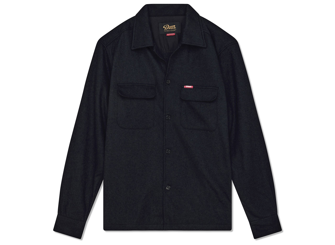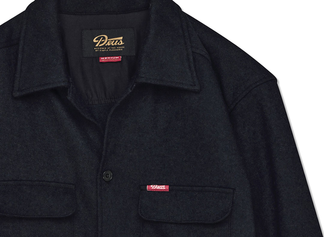 DEUS EX MACHINA Clayton Wool Shirt Black DMF255291. Chemise coupe décontractée. Confectionnée en 73% polyester et 27% laine. Deux poches poitrine à rabat. Etiquette DEUS sur la poche gauche.