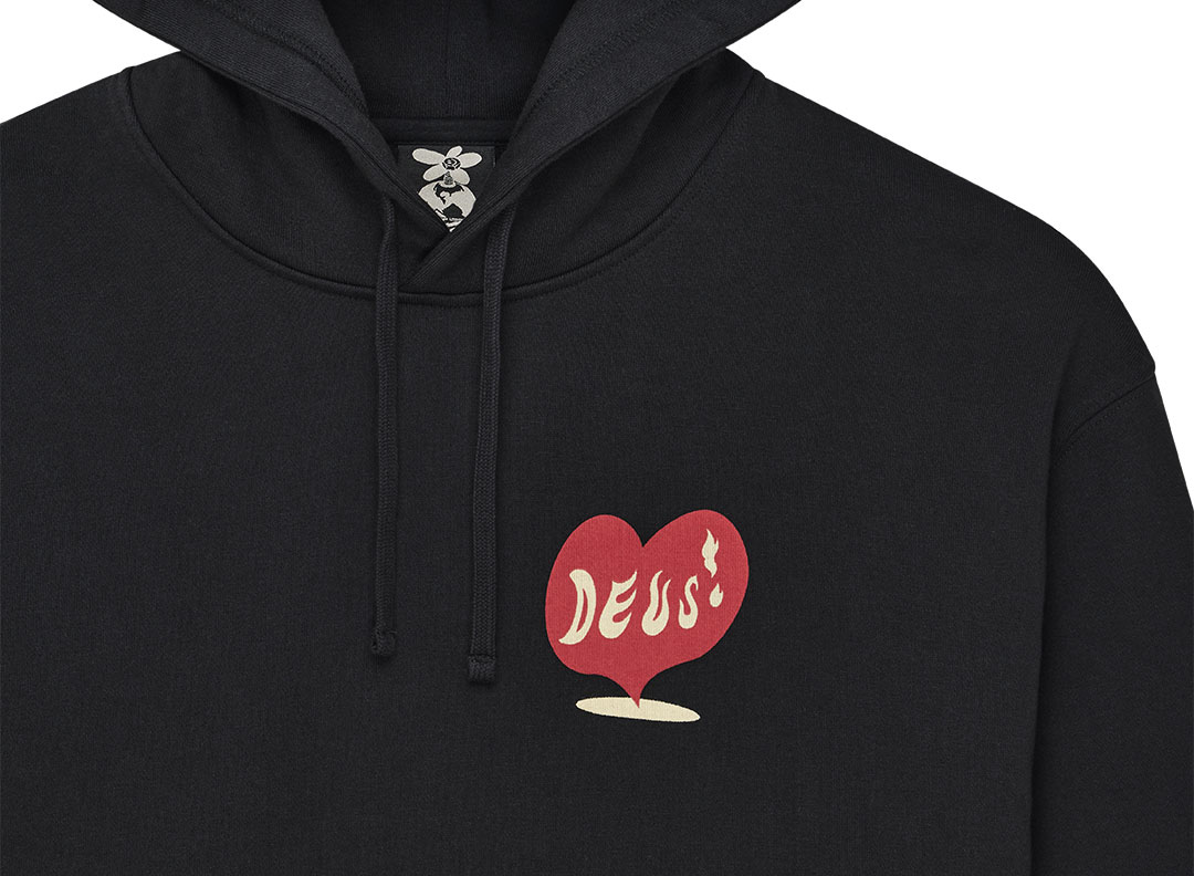 DEUS EX MACHINA Deep Cut Hoodie Black DMP258190. Sweatshirt à capuche coupe oversize. 100% coton recyclé. Poche kangourou sur le bas. Impression sur la poitrine et au dos. Bords-côtes aux poignets et sur le bas.
