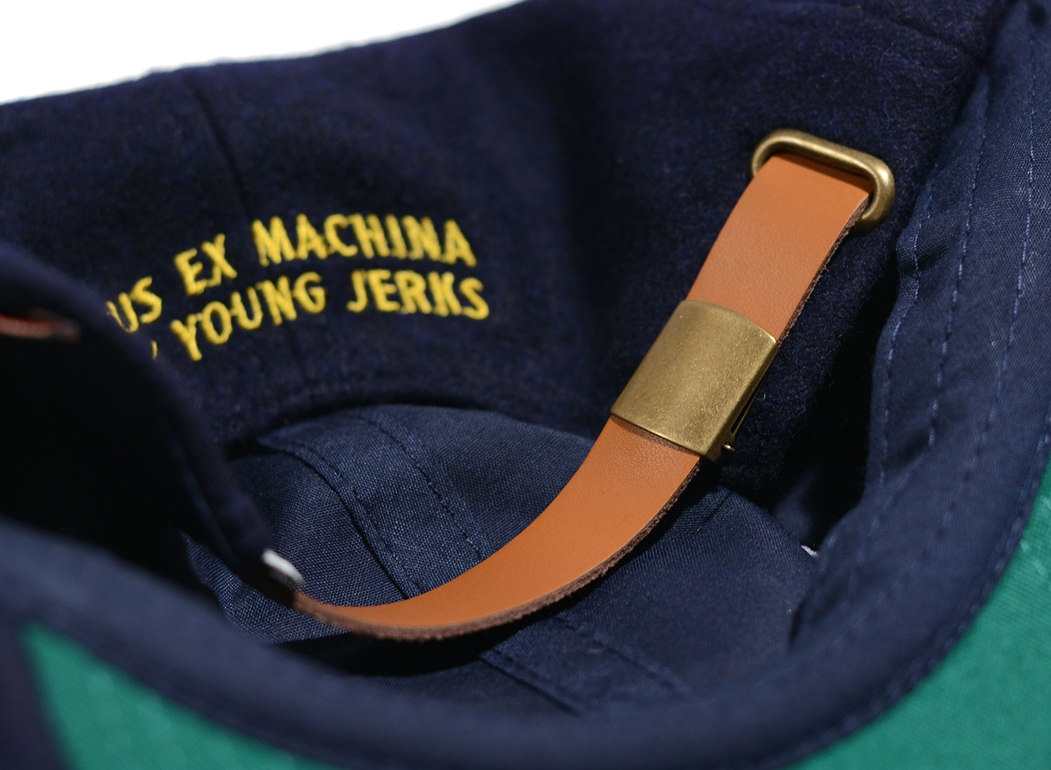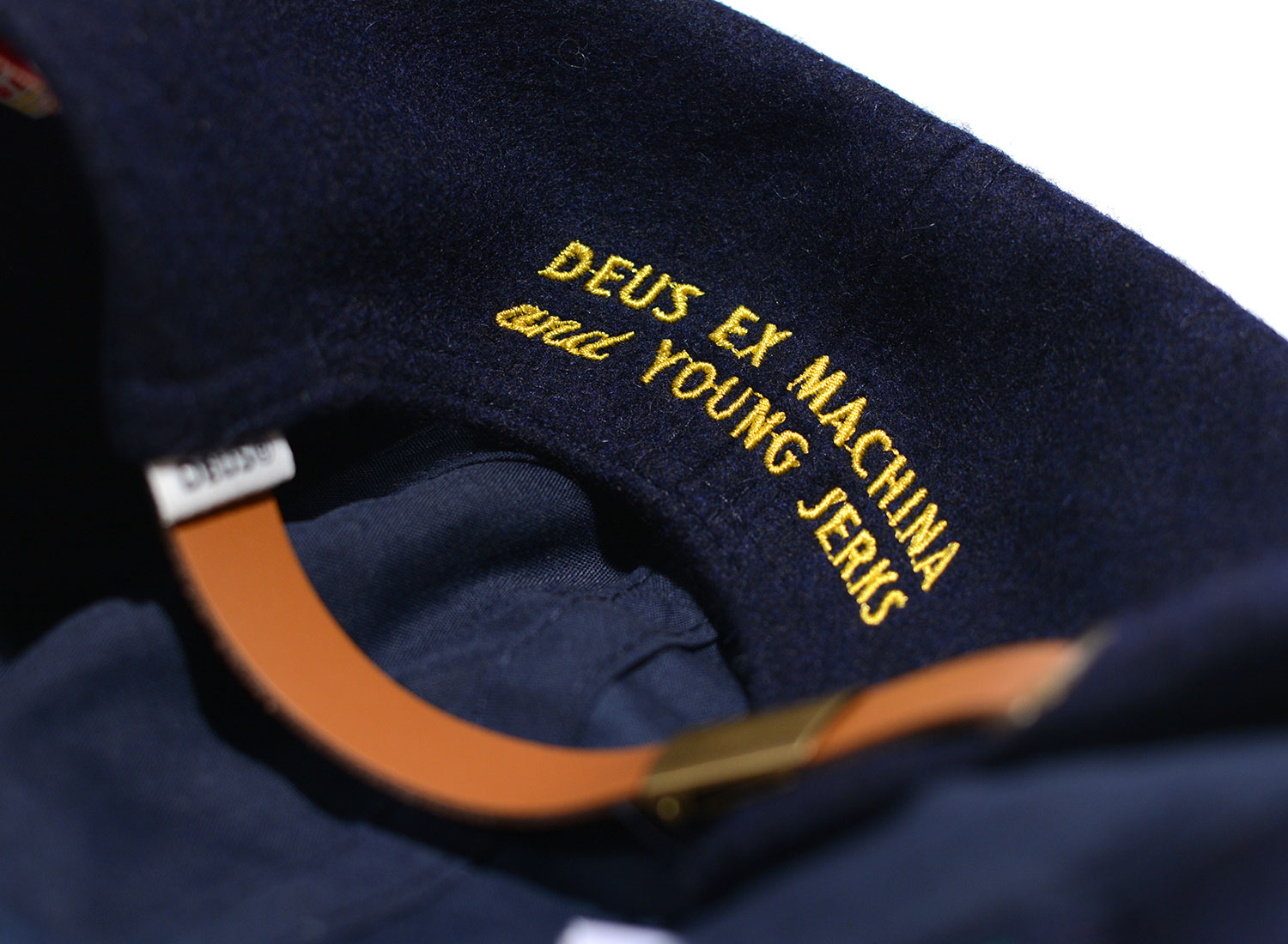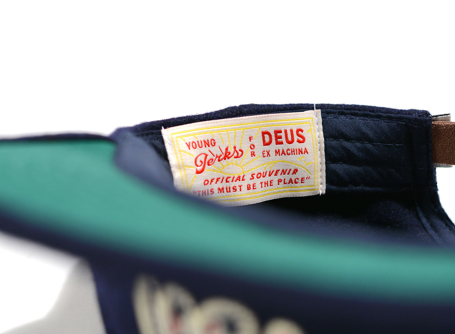 DEUS EX MACHINA X YOUNG JERKS Official Souvenir Cap Navy. Casquette réglable confectionnée en flanelle. Détails de broderies et patchs.