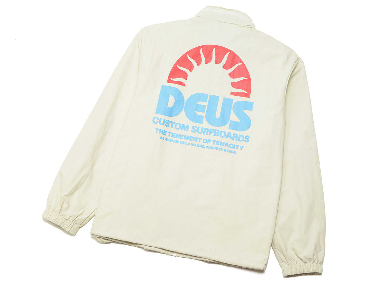 DEUS EX MACHINA Offshore Windstopper Dirty White. Coach Jacket Coupe regular confectionné dans un tissu coupe vent 100% polyamide. Doublure polyamide. Fermeture zippée. Poignets élastiqués. Cordon de serrage sur le bas. Poches zippées sur le bas. Capuche cachée dans le col. Impression poitrine et au dos.
