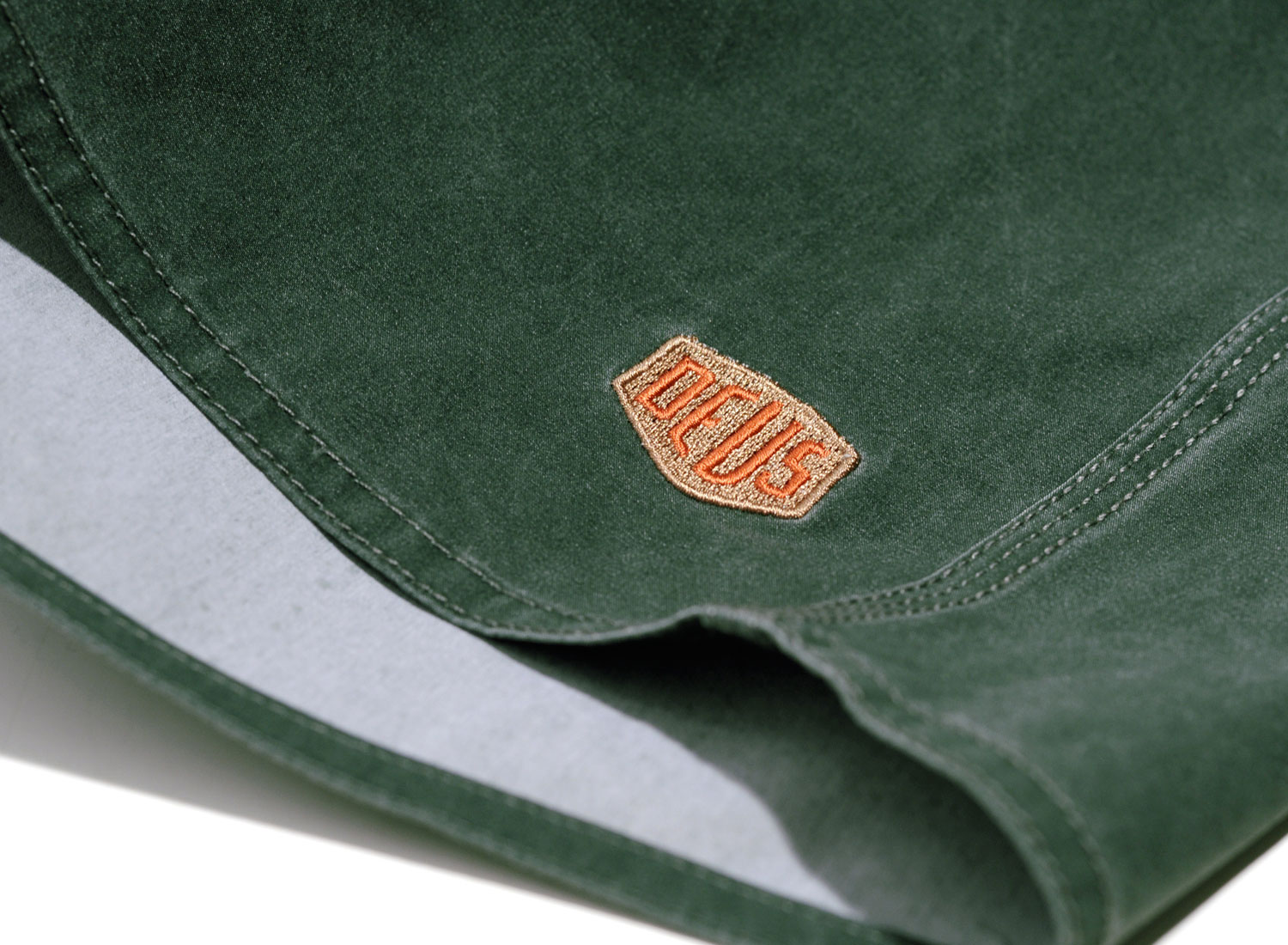 DEUS EX MACHINA Randall Premium Thyme Green Boardshort. Joli maillot confectionné dans un tissu lavé 100% Polyester. Longueur au dessus du genou. Cordon de serrage à la taille. Une poche à l'arrière avec zip étanche. Braguette boutonnée. Broderie "DEUS" sur le bas.