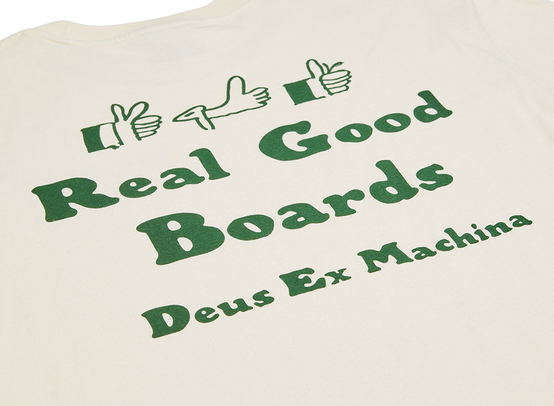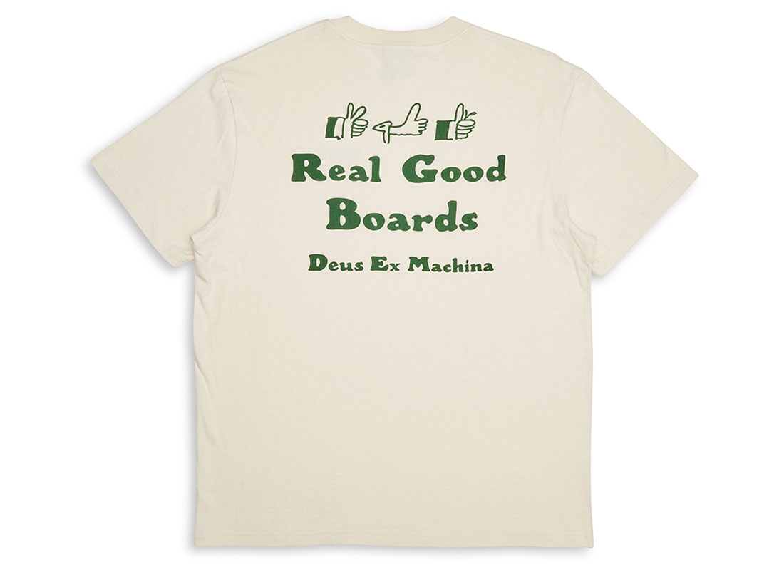 DEUS EX MACHINA Real Good Tee Dirty White. T-shirt coupe loose. 100% coton recyclé. Impression sur la poitrine et au dos. Bord-côte au col.