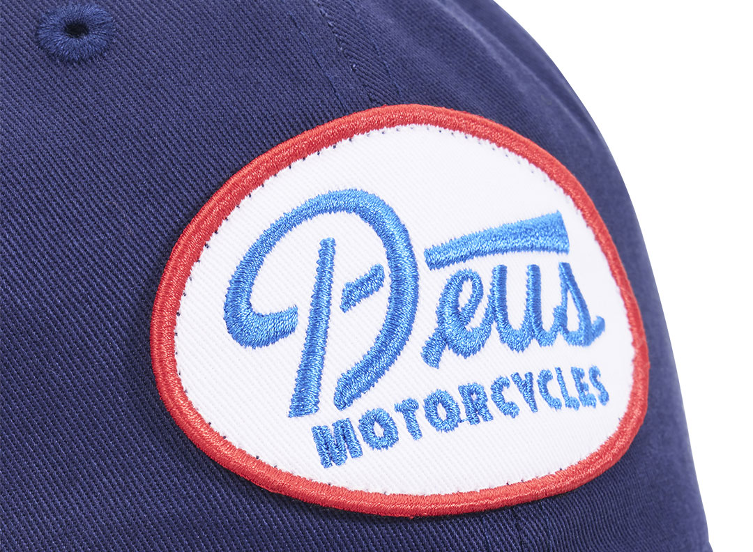 DEUS EX MACHINA Sal Cap Navy DMF257288. Casquette confectionnée en 100% coton. Patch DEUS Motorcycles sur l'avant. Broderie à l'arrière. Sangle arrière ajustable pour un ajustement personnalisé. Taille unique.