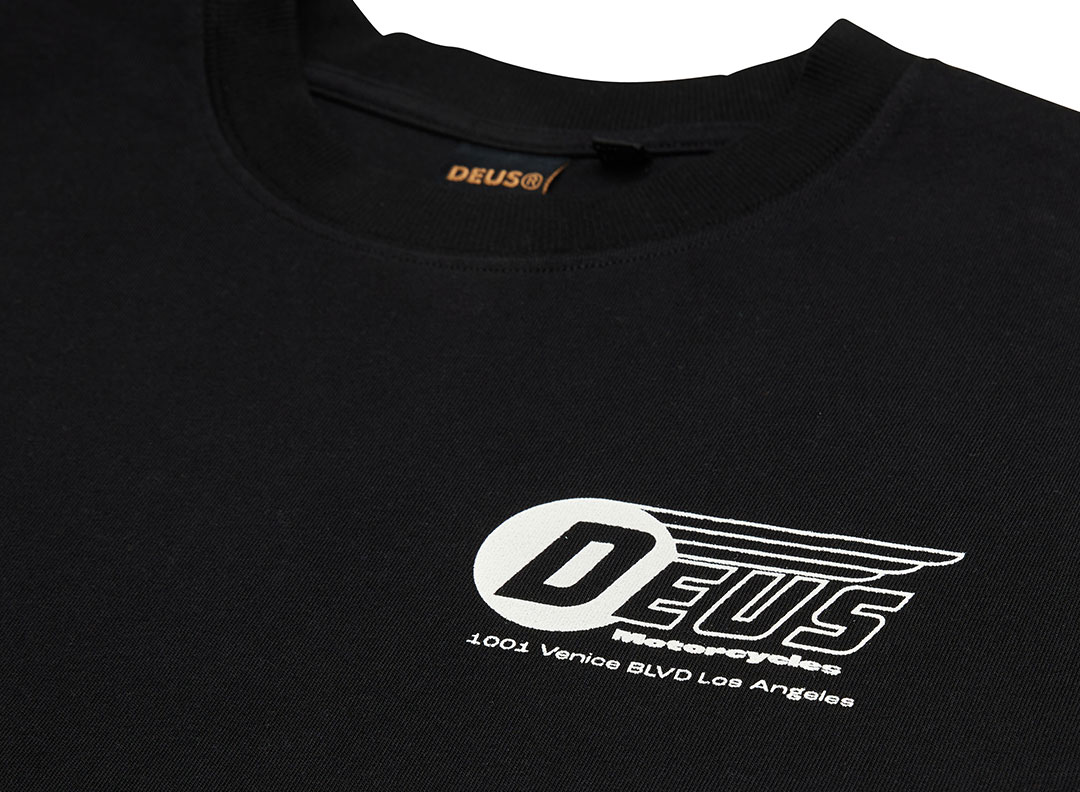 DEUS EX MACHINA Stranger Tee Anthracite. T-shirt coupe boxy. 64% coton, 34% nylon Cordura. Tissu résistant et respirant. Impression sur la poitrine et au dos. Bord-côte au col.