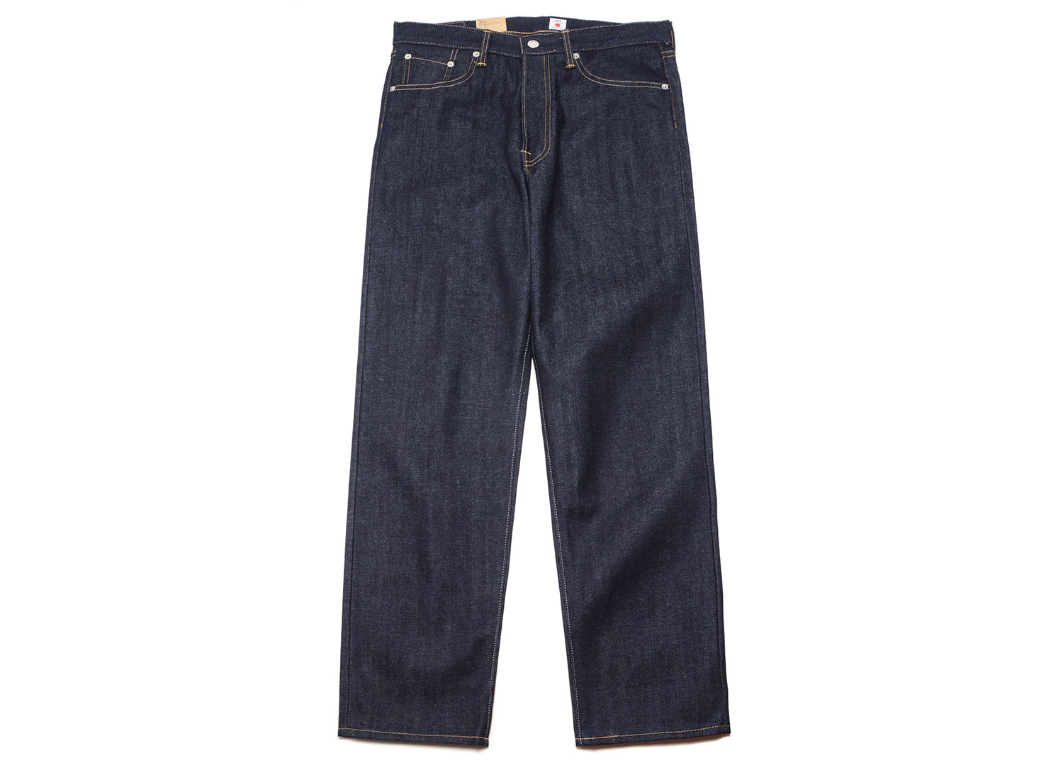 EDWIN Loose Fit Kurabo Denim Red Selvage Blue Unwashed I034256. Coupe loose droite. Taille haute. Denim japonais KURABO 14oz 100% coton recyclé. Red Selvedge. Braguette boutonnée. Patch en papier 100 % pulpe au dos. Fabriqué au Japon