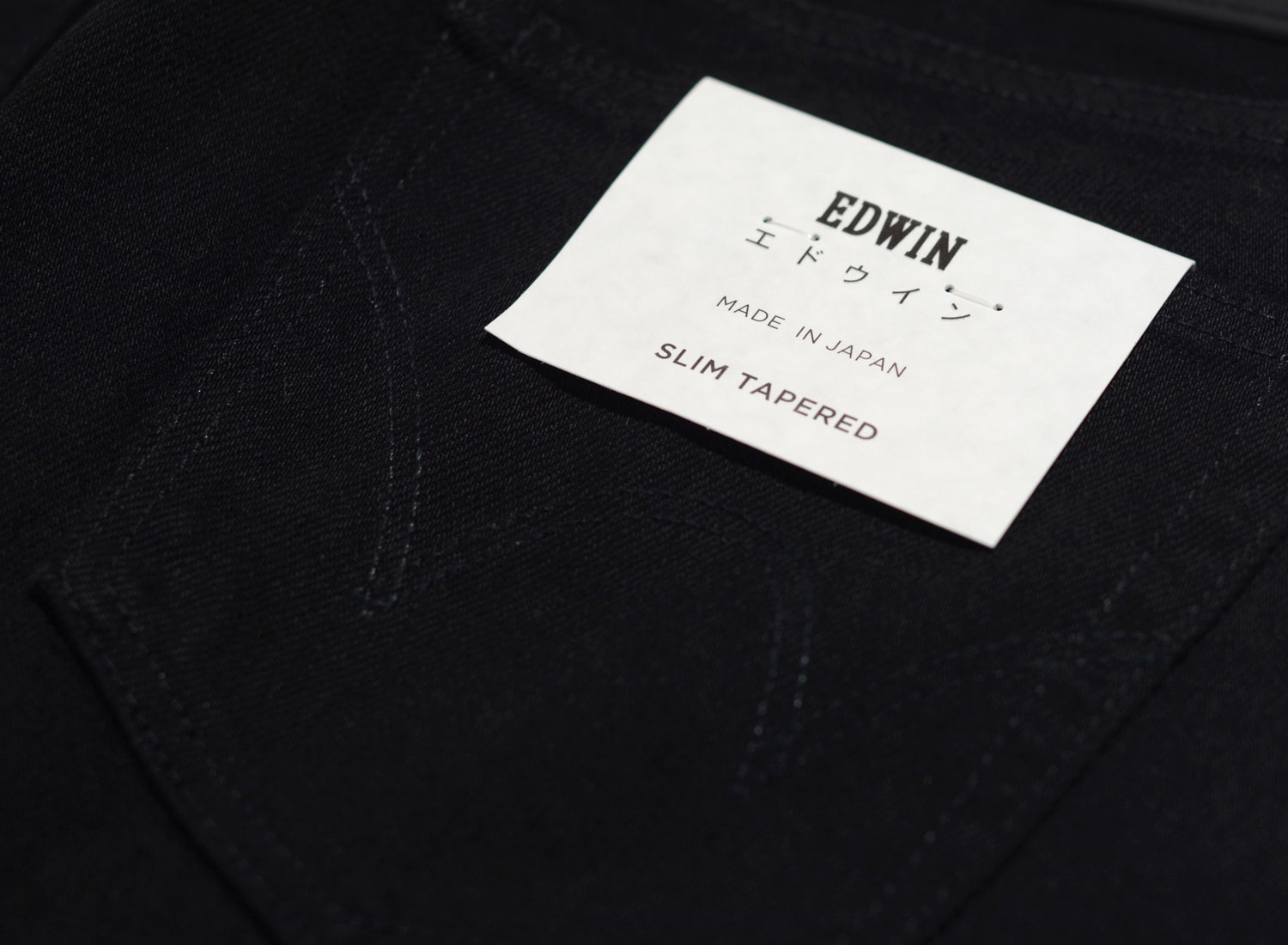 EDWIN Slim Tapered Kaihara Denim Black I027658. Le Slim Tapered est basé sur la coupe du slim ED-85. Il est confectionné en denim japonais green selvedge. 98% coton / 2% élasthanne. Patch cuir. Braguette zippée. Fabriqué au Japon.