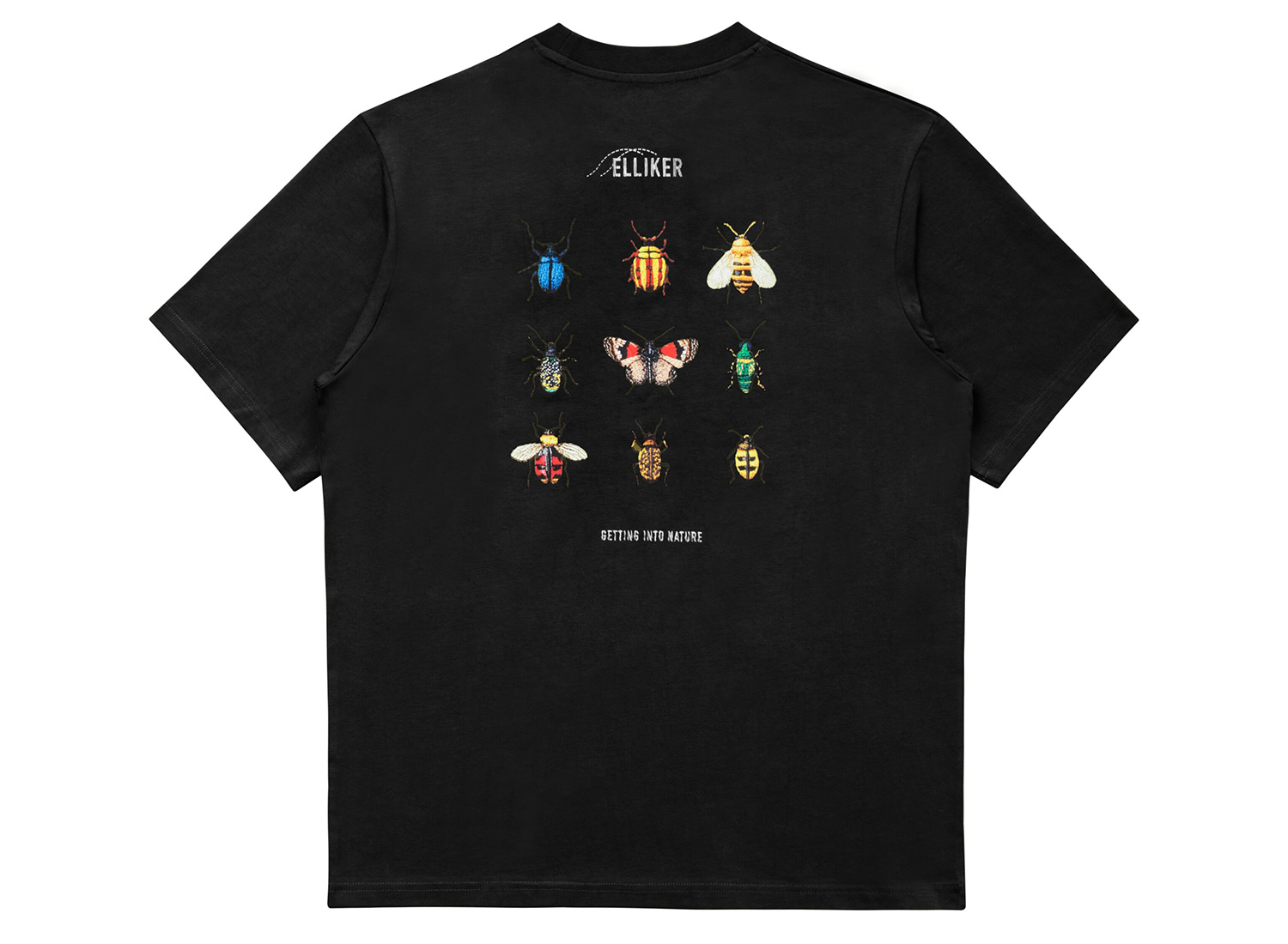 ELLIKER Rill Bug Print Tshirt Black NS40155. T‑shirt manches courtes réalisé dans un tissu épais 220 GSM en coton peigné 100 % biologique. Coupe relax. Encolure ronde côtelée. Impressions sérigraphiées à l’avant et au dos, motif « bug ». Petit logo tissé sur la manche.