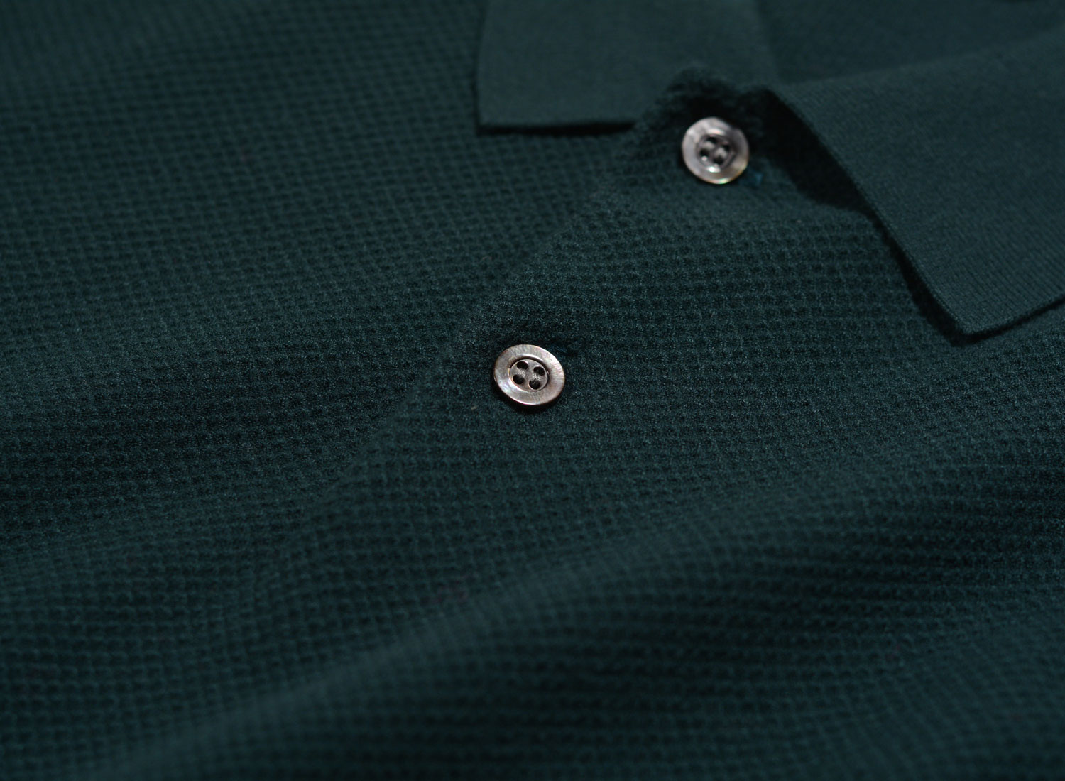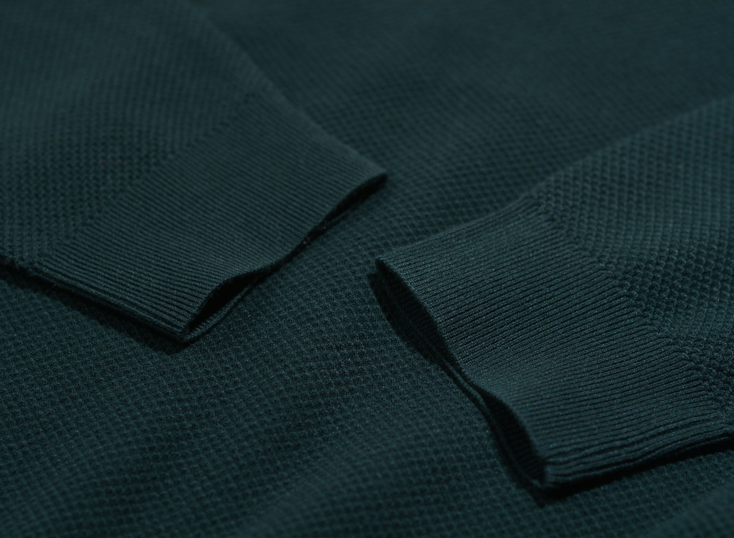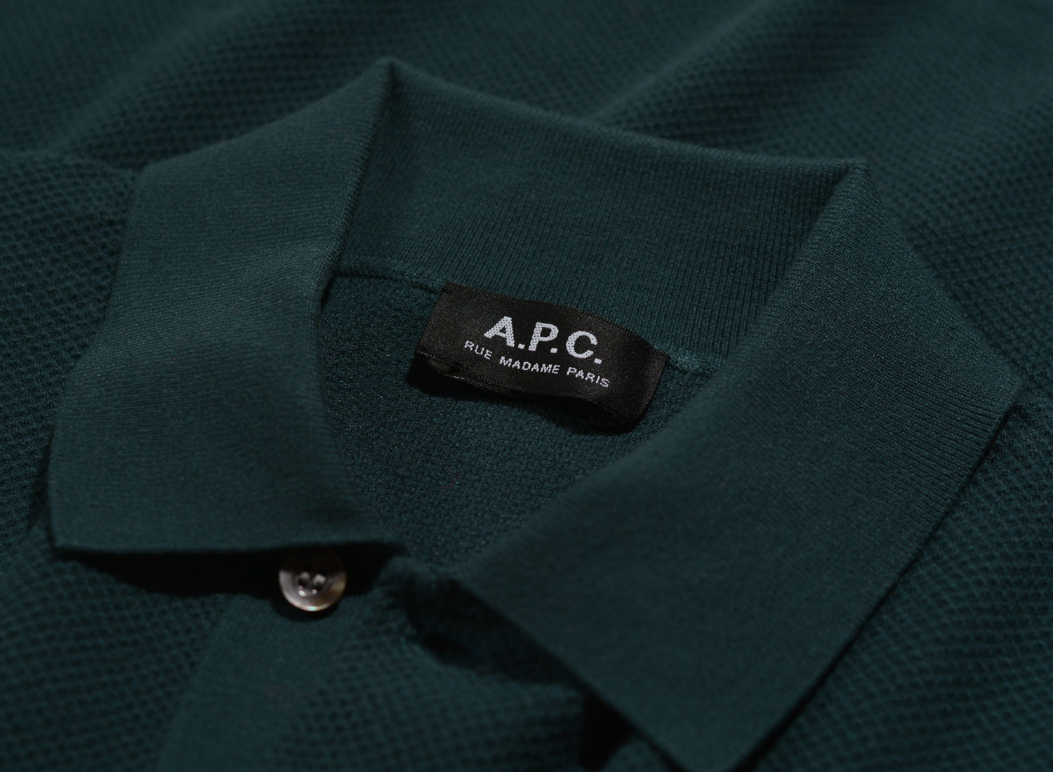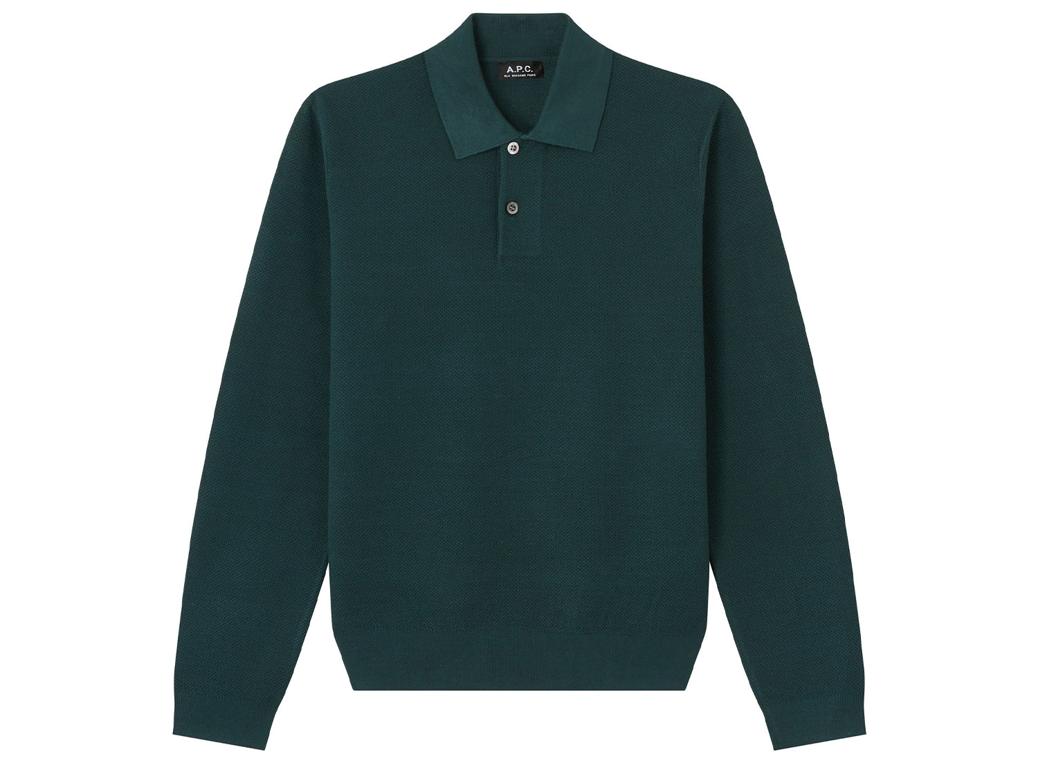 APC Polo Kyle Vert Fonce. Regular fit L/S polo made from honeycomb knitted fabric. 76% viscose / 24% polyamide. Ribbed collar, cuffs and hem.