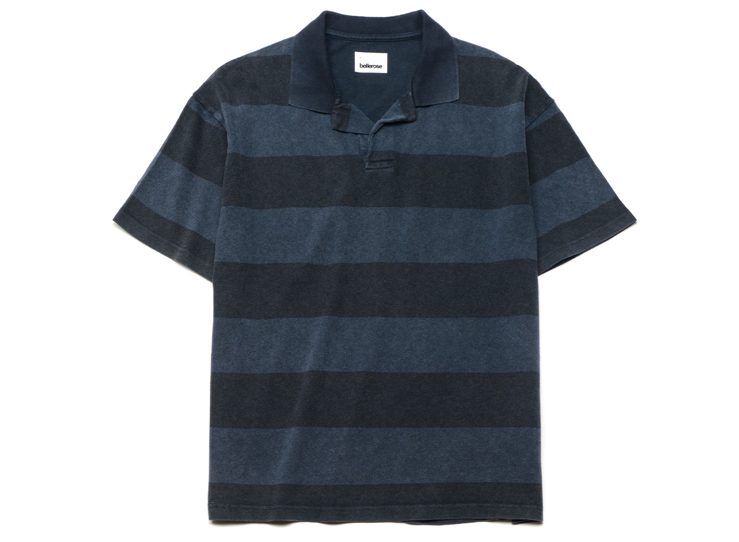 BELLEROSE Forst61 Polo Stripe E. Forst polo by Bellerose. Mid-weight textured cotton jersey with bold stripes. Washed finish. Oversized fit. Take your usual size for a loose fit or size down for a closer silhouette. Ribbed collar. Button placket. Short sleeves. Straight hem. 100% cotton.