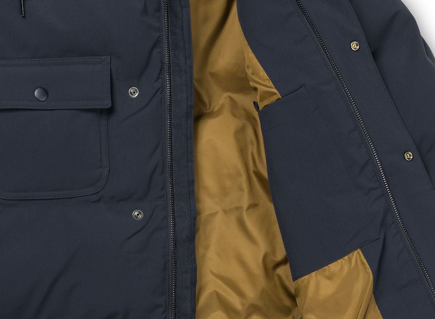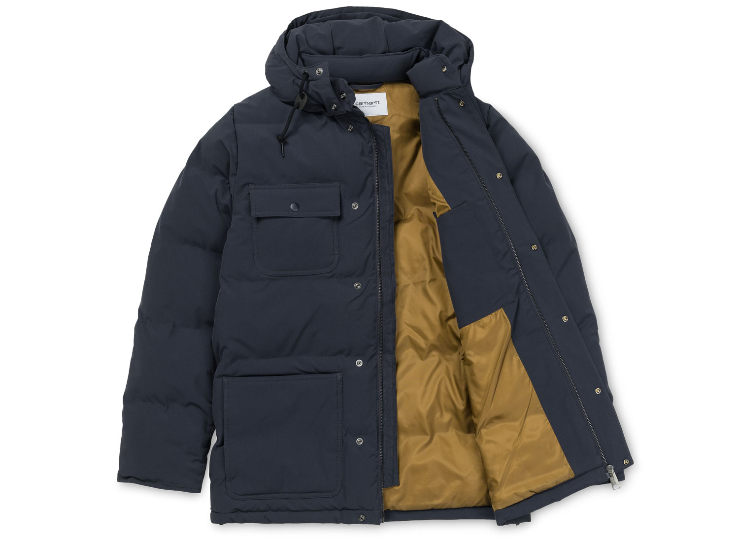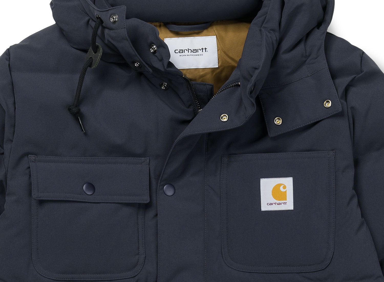 CARHARTT WIP Alpine Coat Dark Navy I023081. Heavy hooded parka made from waterproof fabric. 85% Nylon / 5% Spandex. Regular fit. Nylon taffeta lined. Adjustable and removable hood. Adjustable bottom band. Rib-knit storm cuffs. Front closure with snap buttons and hidden two-way zip. Pockets with hidden zip. Square label.
