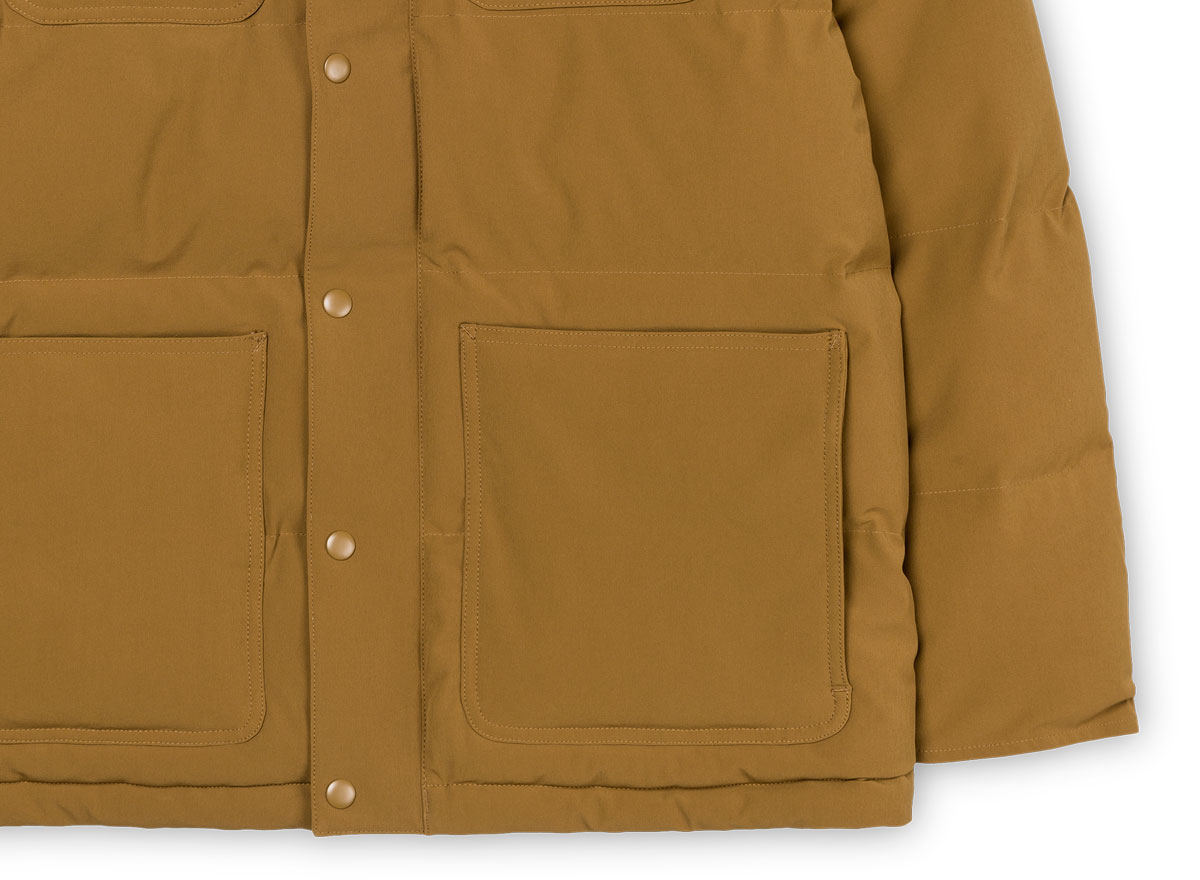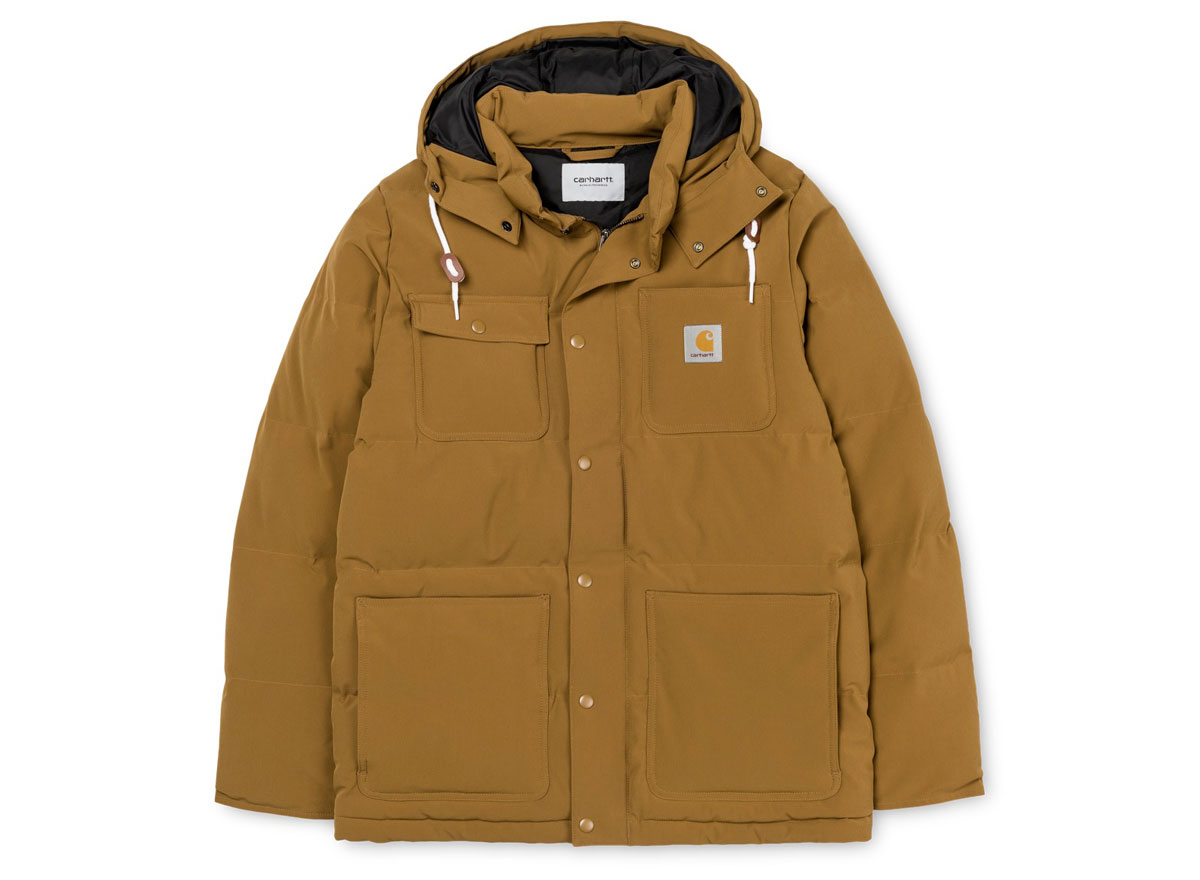 CARHARTT WIP Alpine Coat Hamilton Brown / Black I023081. Heavy hooded parka made from waterproof fabric. 85% Nylon / 5% Spandex. Regular fit. Nylon taffeta lined. Adjustable and removable hood. Adjustable bottom band. Rib-knit storm cuffs. Front closure with snap buttons and hidden two-way zip. Pockets with hidden zip. Square label.
