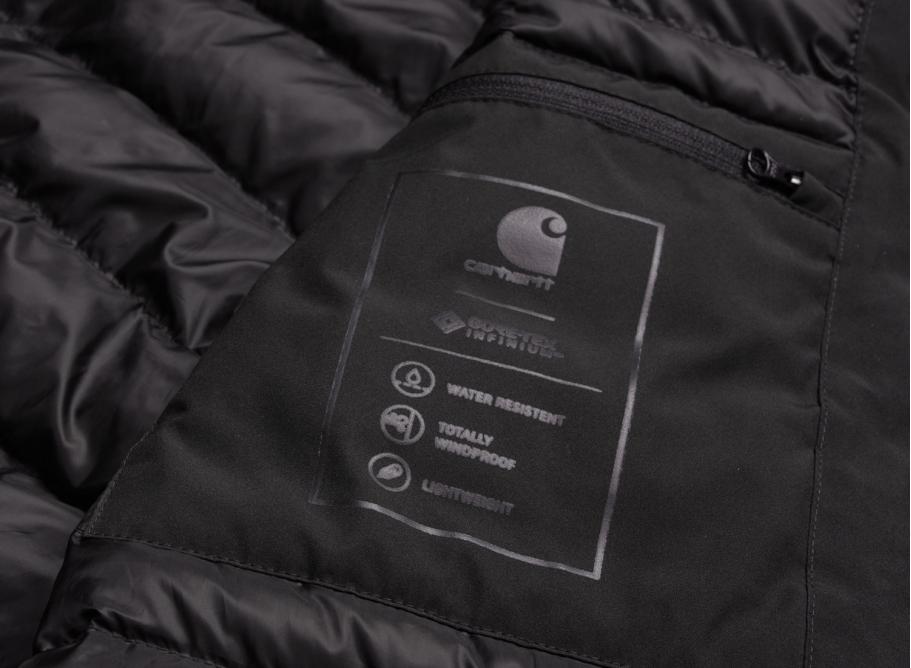 CARHARTT WIP Gore Tex Parka Black I028242. Regular fit hooded parka made from 100% Polyester 2L GORE-TEX INFINIUM™, 3.1 oz. Water resistant, windproof and breathable fabric. Polyester taffeta lined. Adjustable hood, cuffs and bottom band. Neoprene storm cuffs. Front closure with hidden two-way AquaGuard® zip. Front pockets with AquaGuard® zip. Graphic print at back. Square label print.