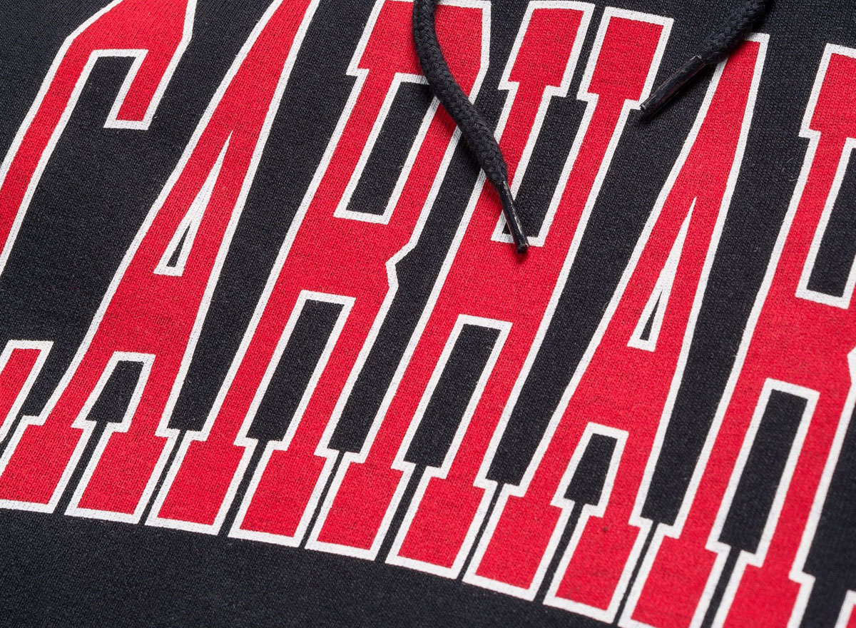 CARHARTT WIP Hooded Division Sweatshirt Navy. Regular fit hooded sweatshirt made from heavy fleece fabric. 58% cotton / 42% Polyester. Drawcord on hood. Ribbed cuffs and hem. Kangarou pocket. Silkscreen print on chest.