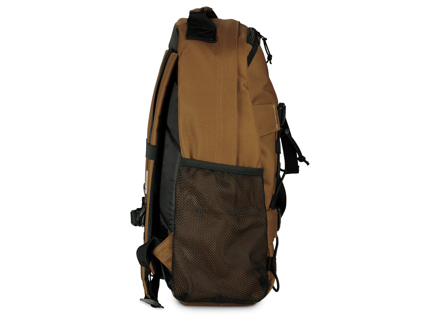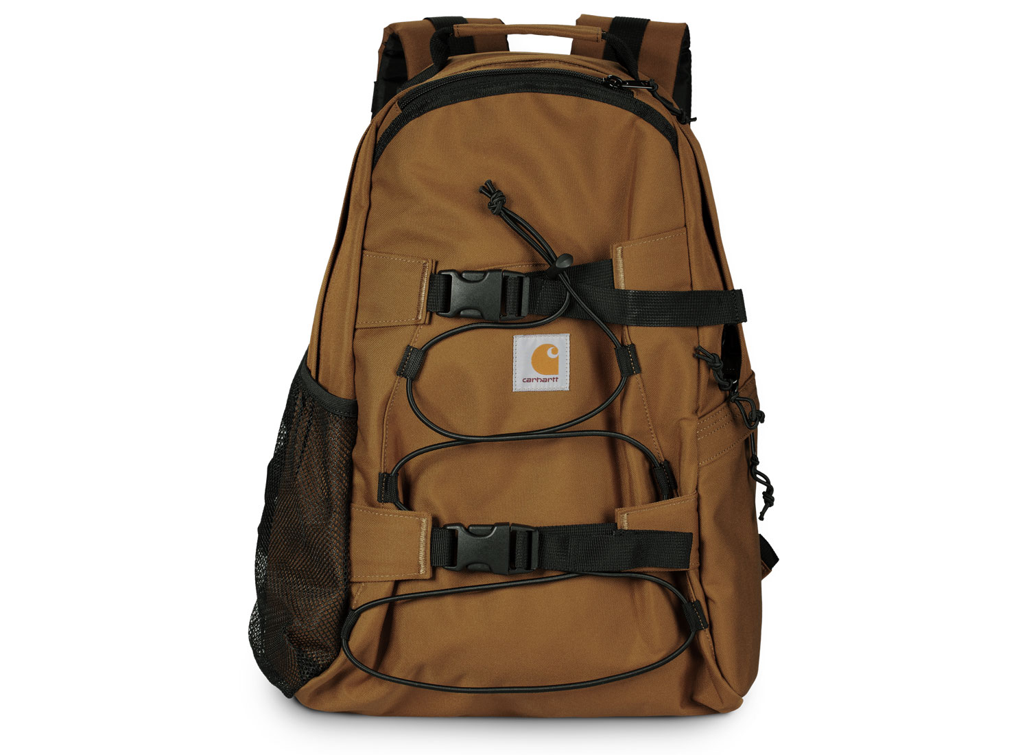 CARHARTT WIP Kickflip Backpack Hamilton Brown I031468. Backpack made from 97% recycled polyester and 3% polyurethane ripstop canvas. 11oz. Repellent fabric. Two-way zip closure. Side pocket with zip closure. Mesh side pocket. Board fixation with plastic clickers. Measures : 45 x 29 x 19 cm. 24,8L.