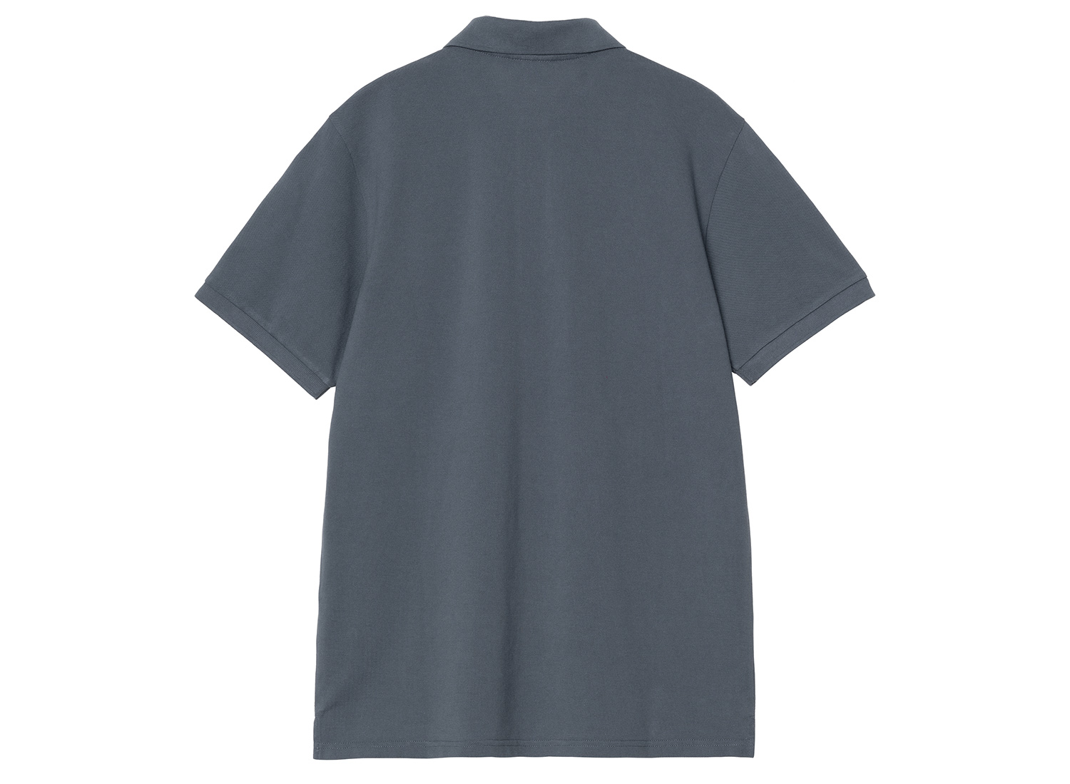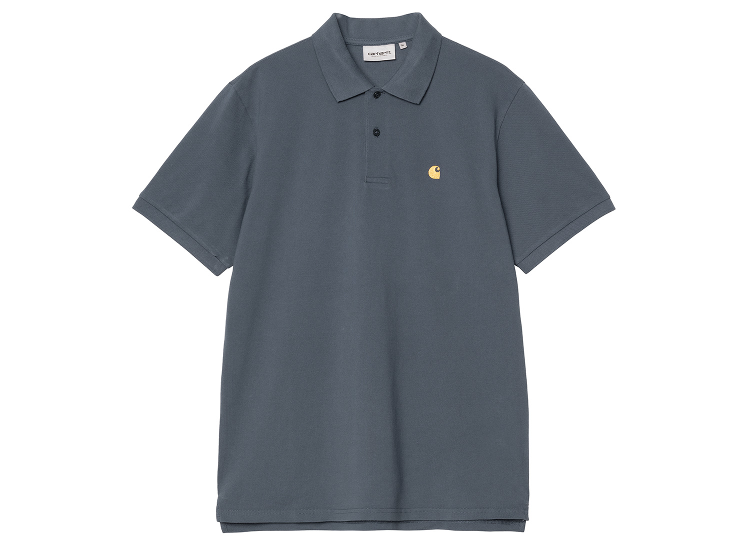 CARHARTT WIP Chase Pique Polo Cozy Blue / Gold I023807. Short-sleeved polo shirt in washed piqué cotton. Relaxed fit. Two-button placket. Chest embroidery. Ribbed collar and cuffs. Discreet side vents at the seams.
