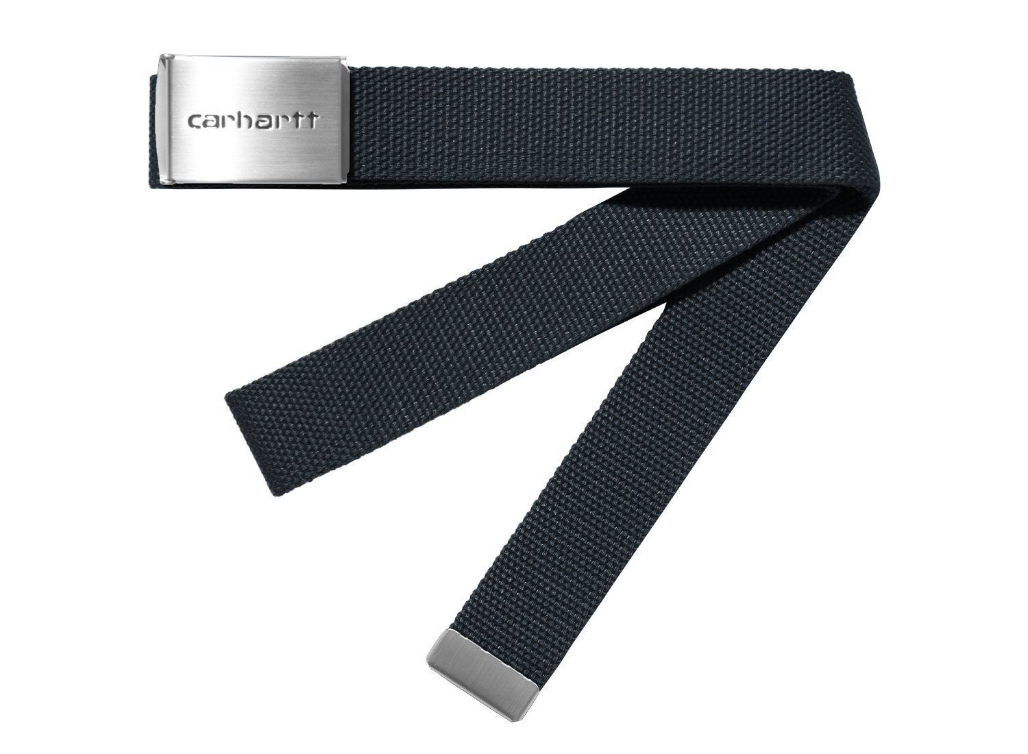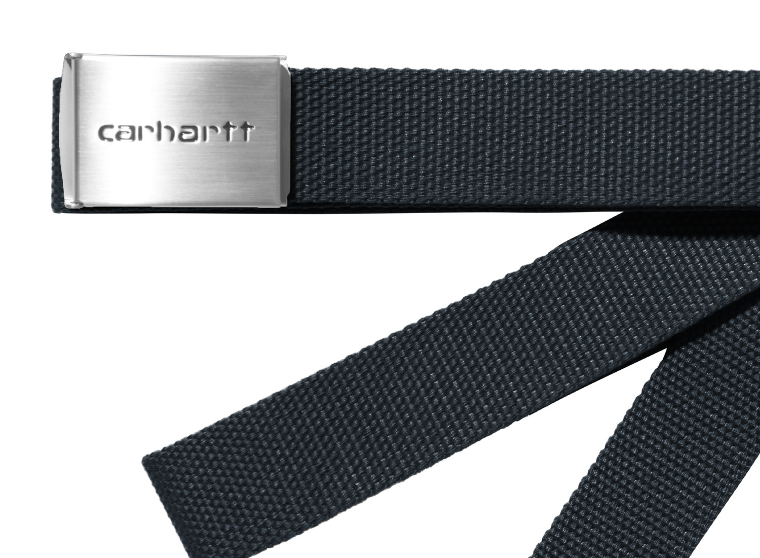 CARHARTT WIP Clip Belt Chrome Deep Night I019176. 100% polyester canvas belt. Adjustable and interchangeable metal buckle. Engraved logo. Dimensions: 3.4 cm x 120 cm.
