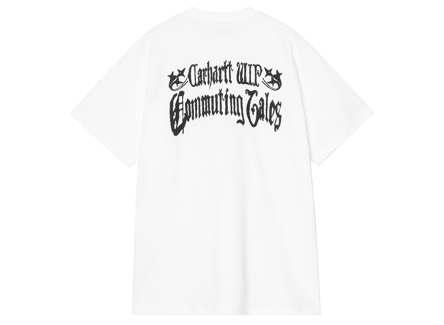 CARHARTT WIP Commuting Tales Tshirt White I036010_02_XX_03. Medium-weight 100% organic cotton jersey T-shirt. Loose fit. Graphic prints on the front and back.