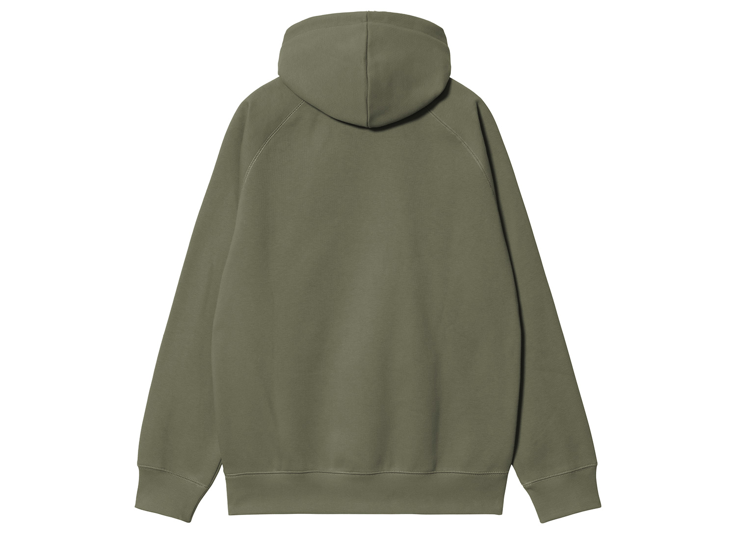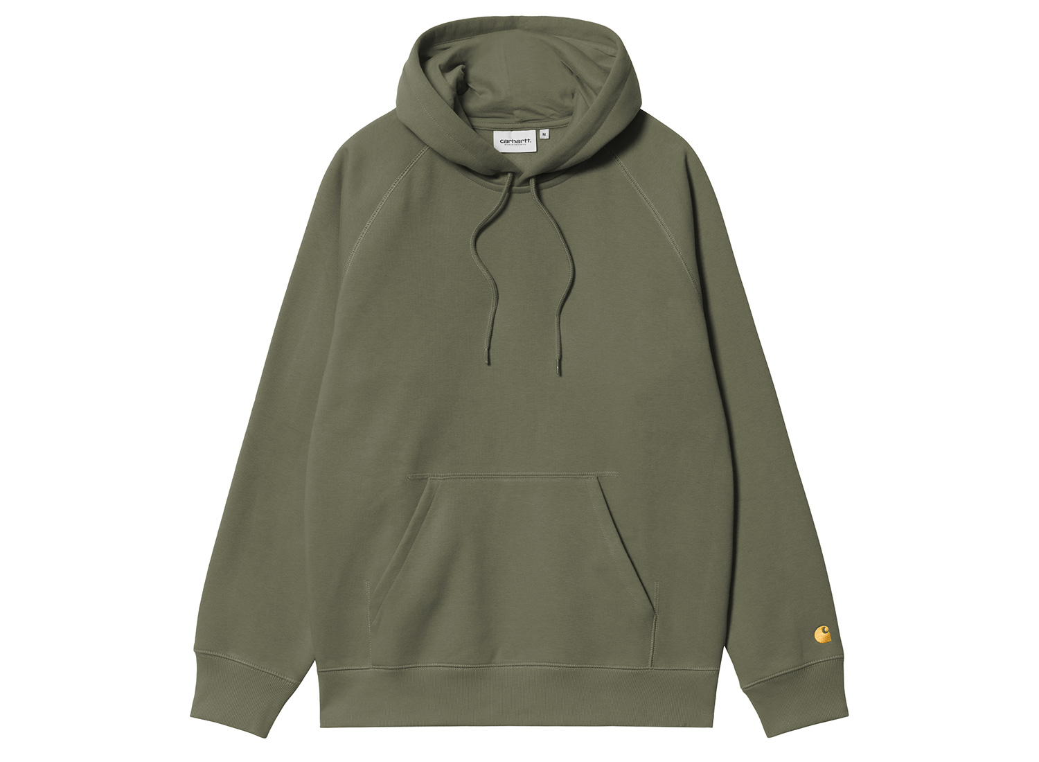 Hooded Chase Sweatshirt Leaf / Gold I033661. Hooded sweatshirt made from 58% cotton and 42% polyester. Raglan sleeves. Straight cut. Rib-edges at the wrists and at the bottom. Carhartt Logo embroidery on the sleeve. Adjustable hood. Kangaroo pocket.