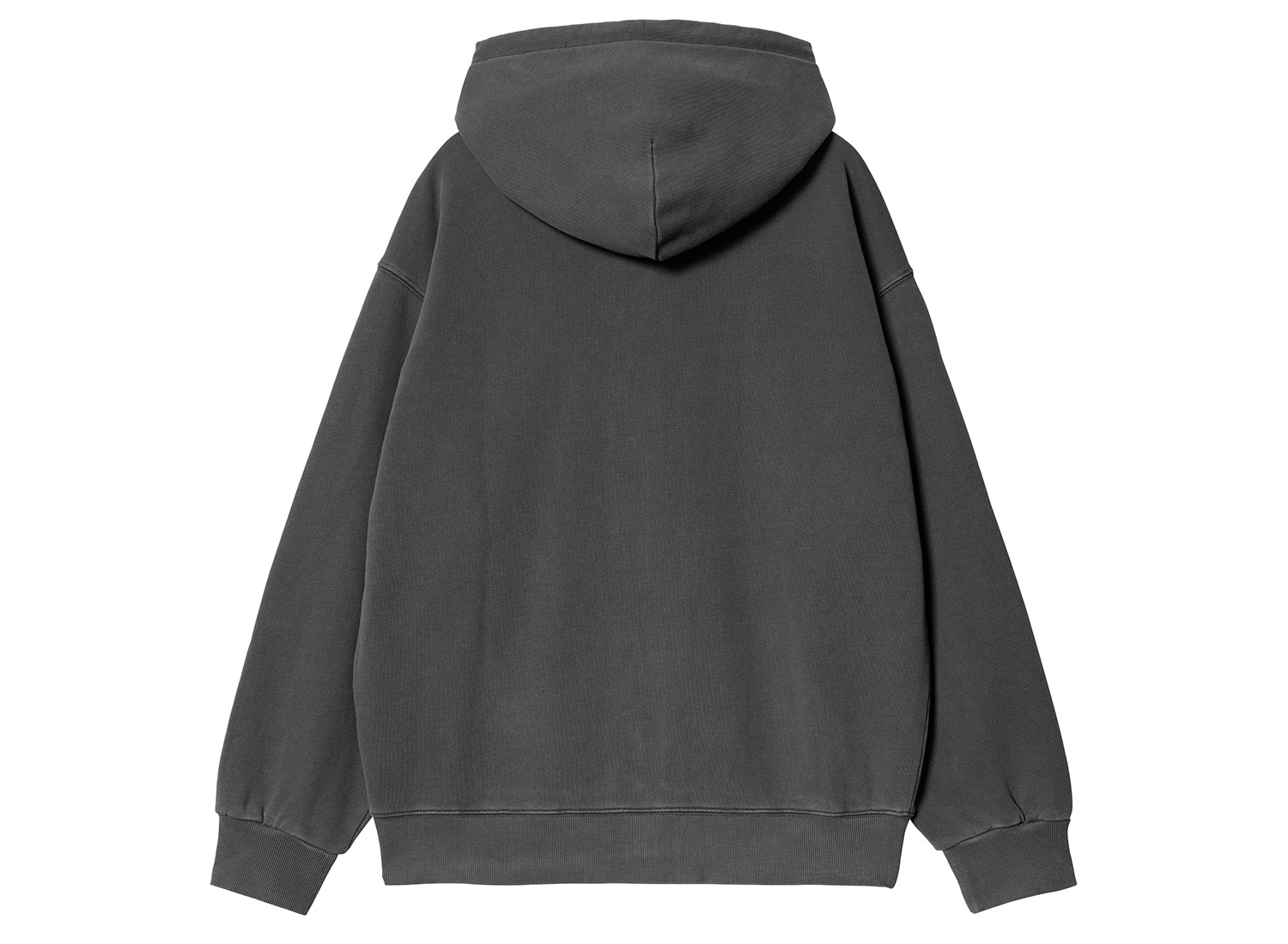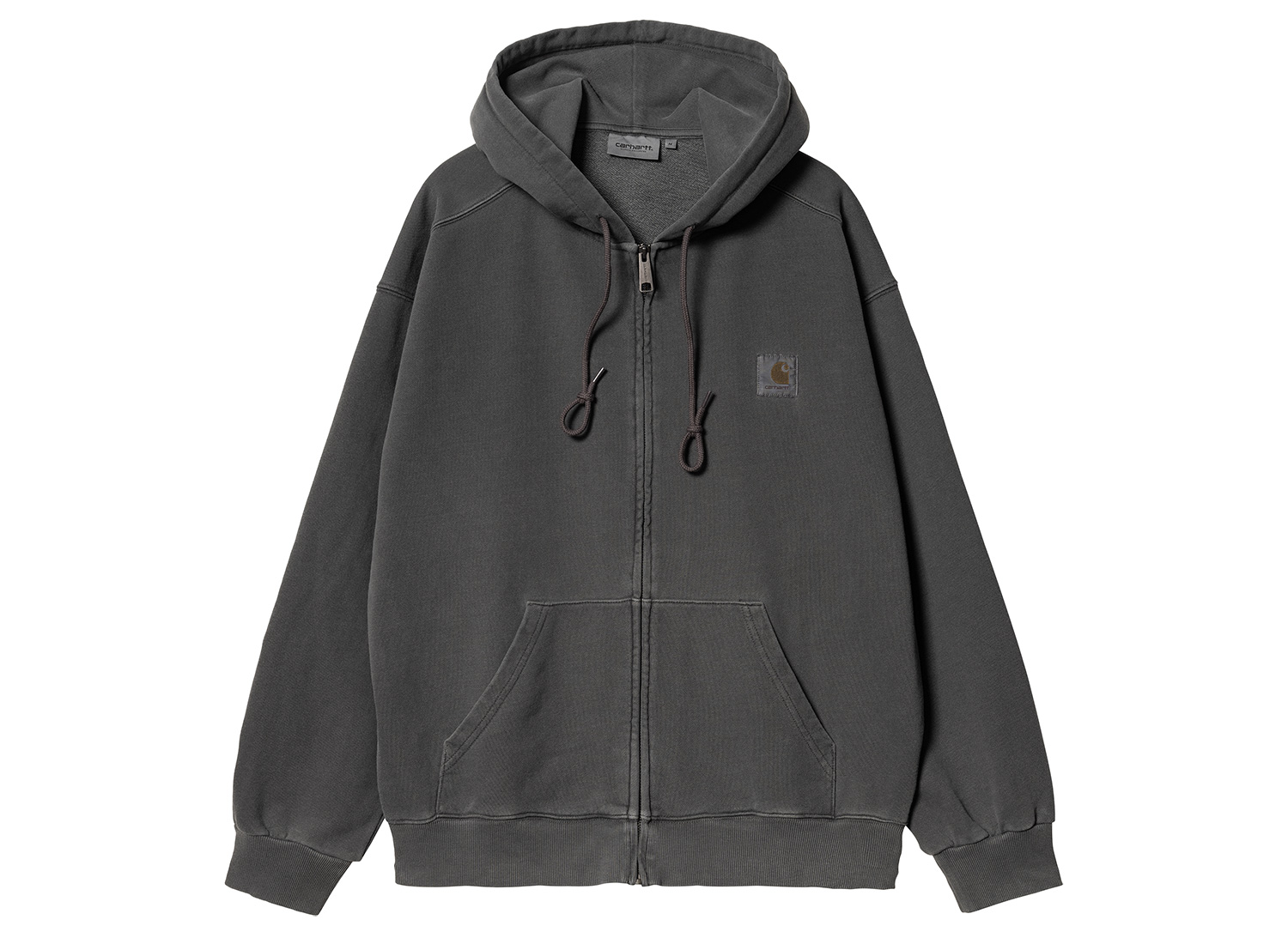 Hooded jacket made in a thick and comfortable thick cotton jersey. Loose fit. Ribbing at cuffs and bottom. Pigment dyed fabric. Carhartt label on the chest.