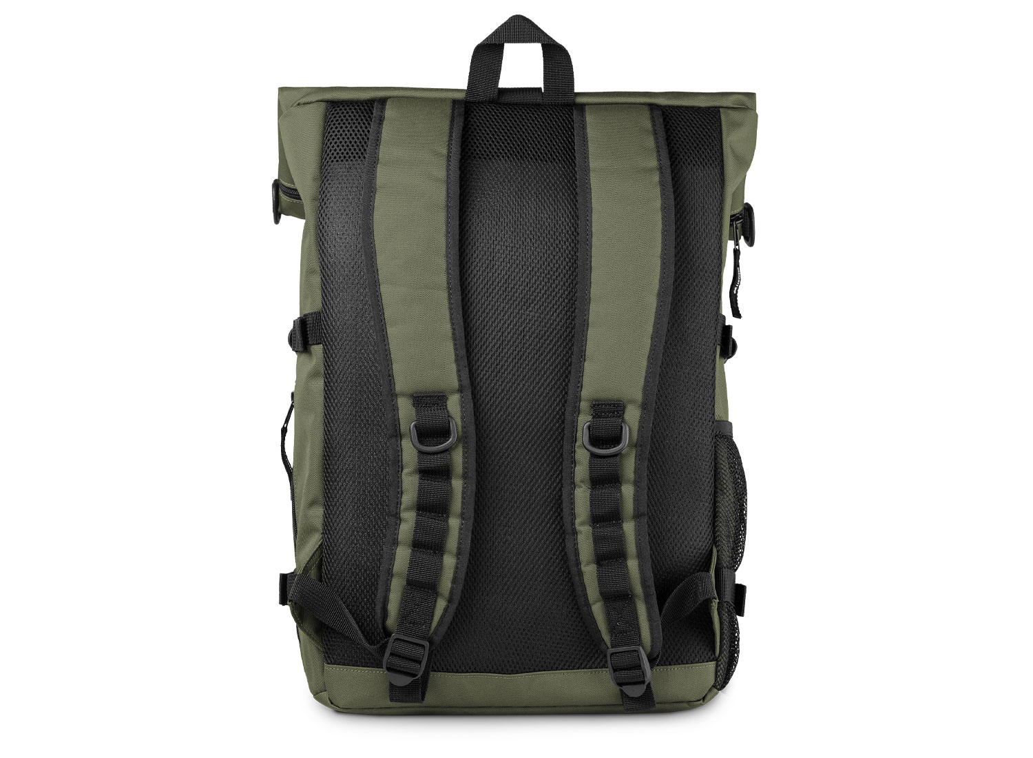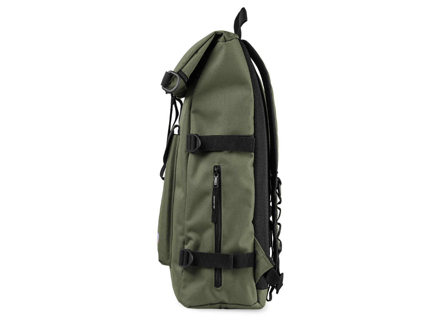 CARHARTT WIP Philis Backpack Leaf I031575. 100% recycled polyester canvas backpack, 11.25 oz. 50 x 33 x 13 cm. 21.5 liters. Water-repellent fabric. Unlined. Adjustable shoulder straps. Front flap pocket with inset zip pocket on left. Interior padded laptop pocket (max. 15"). Square label.